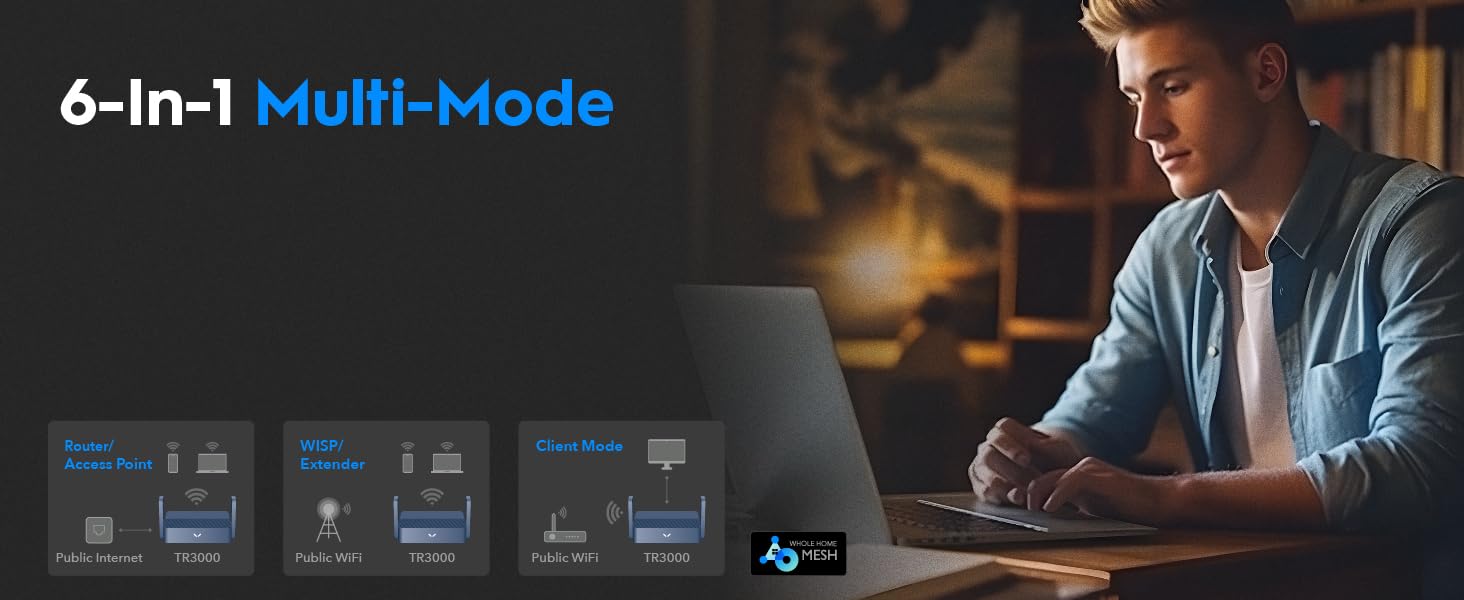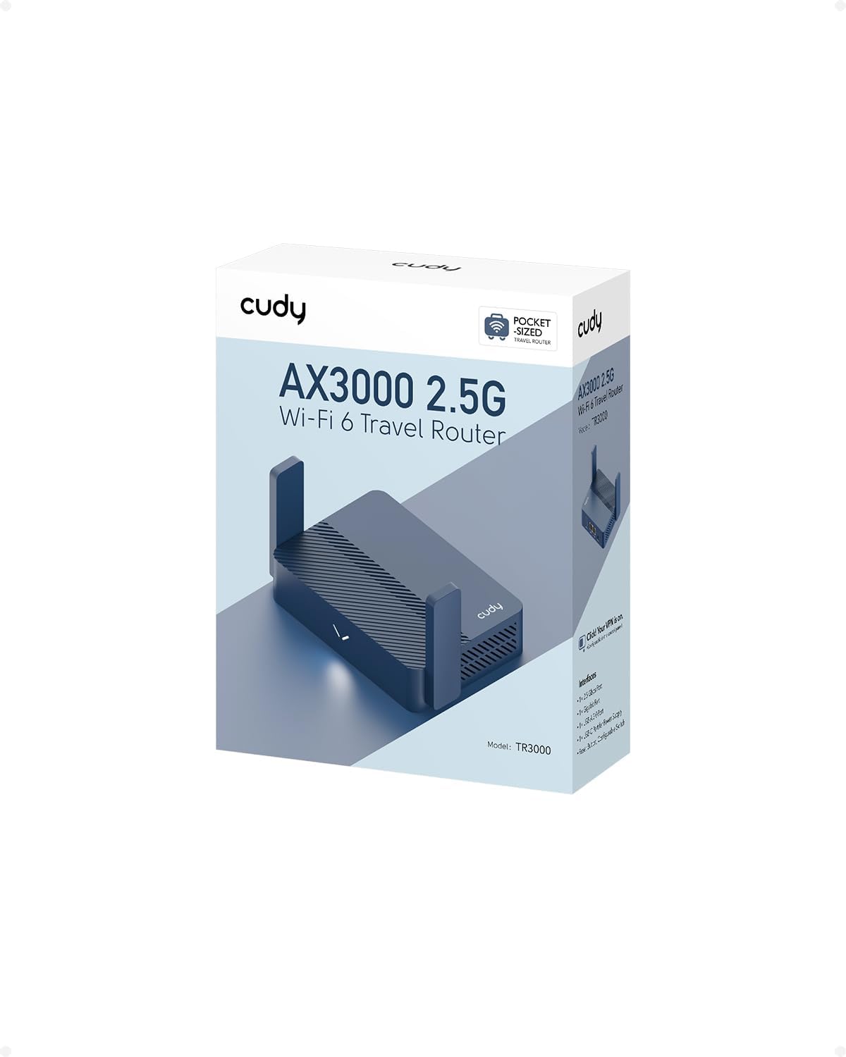 A powerful AX3000 pocket-sized Wi-Fi 6 router for home and travel. The TR3000 uses a 1.3GHz dual-core CPU, offering up to 3Gbps WiFi6 speeds, a 2.5Gbps Ethernet WAN port and a 1Gbps Gigabit LAN port, a USB 3.0 port and multiple VPN support, making it perfect for everyday use and travel.