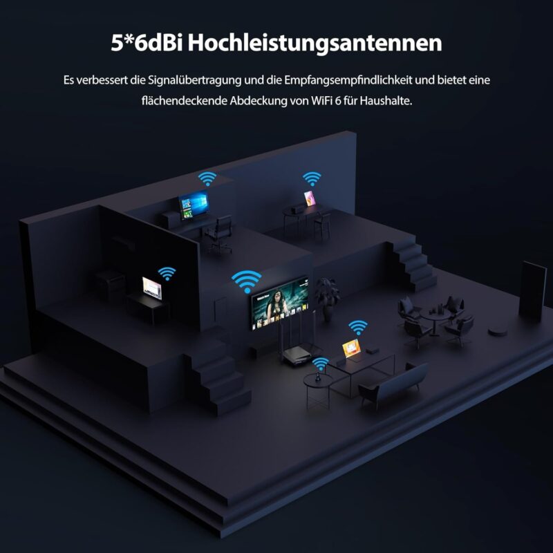 Wide WiFi coverage: RX1 Pro router is equipped with 5 x 6dBi high-performance antennas and 2 signal enhancement modules, so you get WiFi in every corner of your home.
