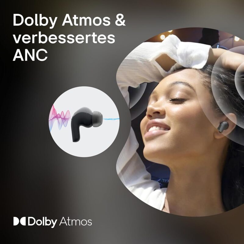 In-ear earphones with 11 mm dine drivers; Dolby Atmos and Dolby Head tracking for spatial sound; Active Noise Cancelling (ANC) for clear sound