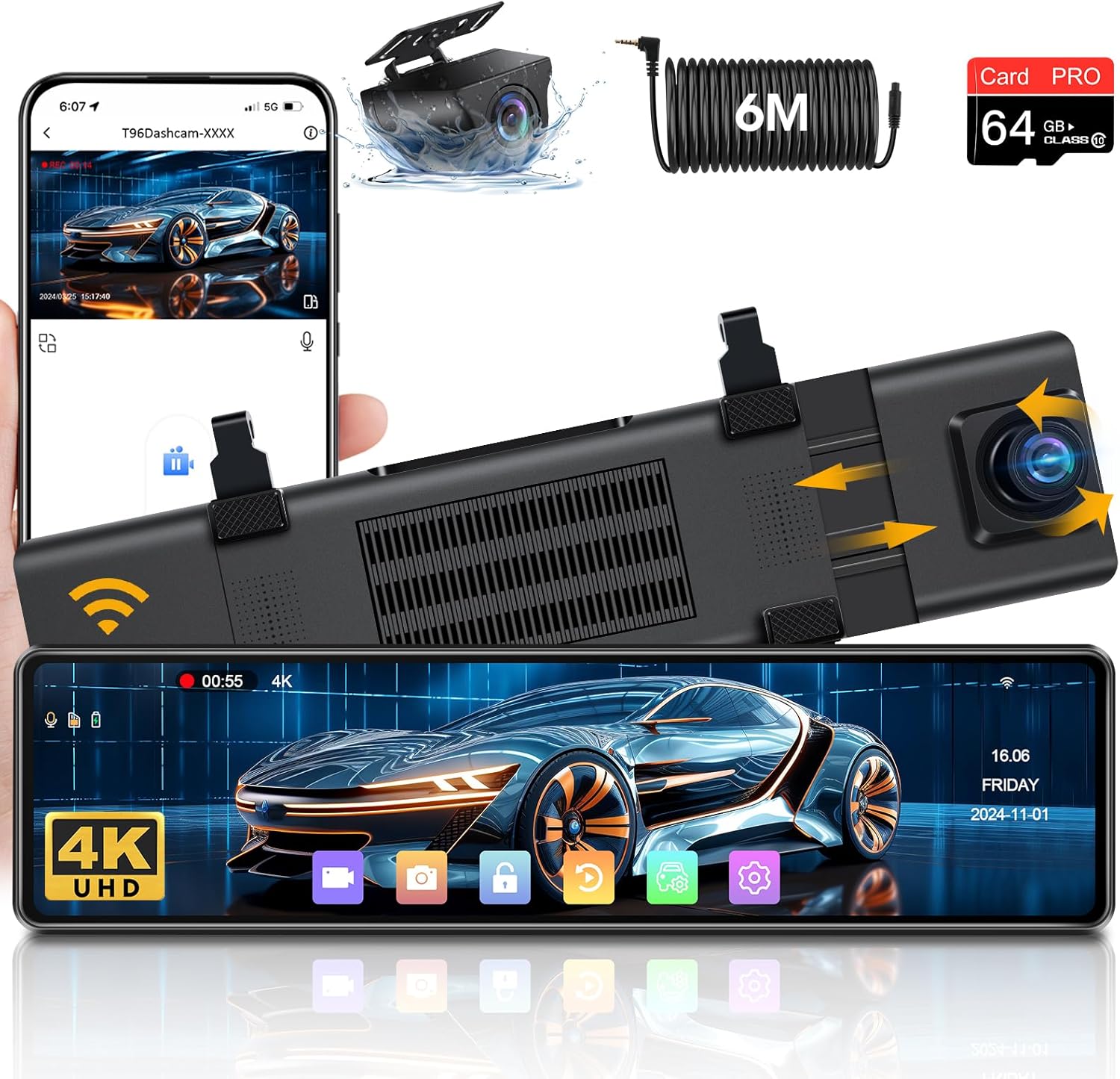 Видеорегистратор Огледало Airpuxem T96 4K WiFi Dash Cam 64GB SD