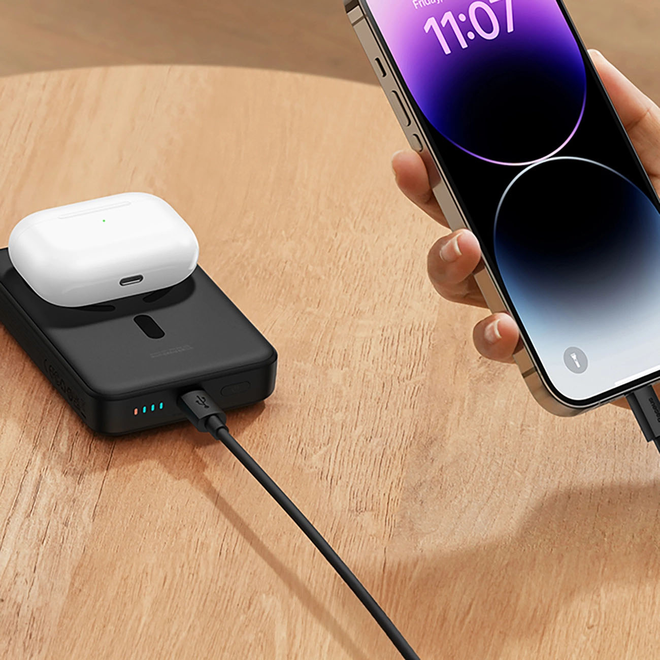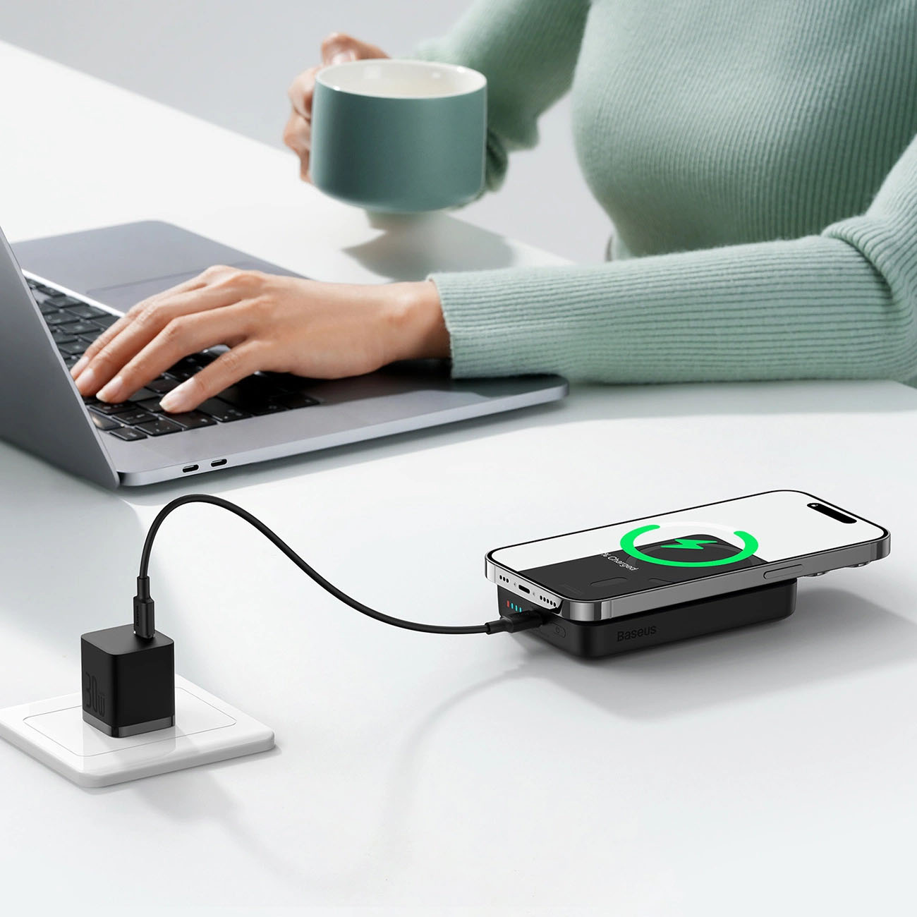 Allows you to wirelessly charge your phone. The Baseus Magnetic Mini model is equipped with a magnetic mount, which means that simply placing the powerbank on the back of the phone automatically starts the inductive charging process.