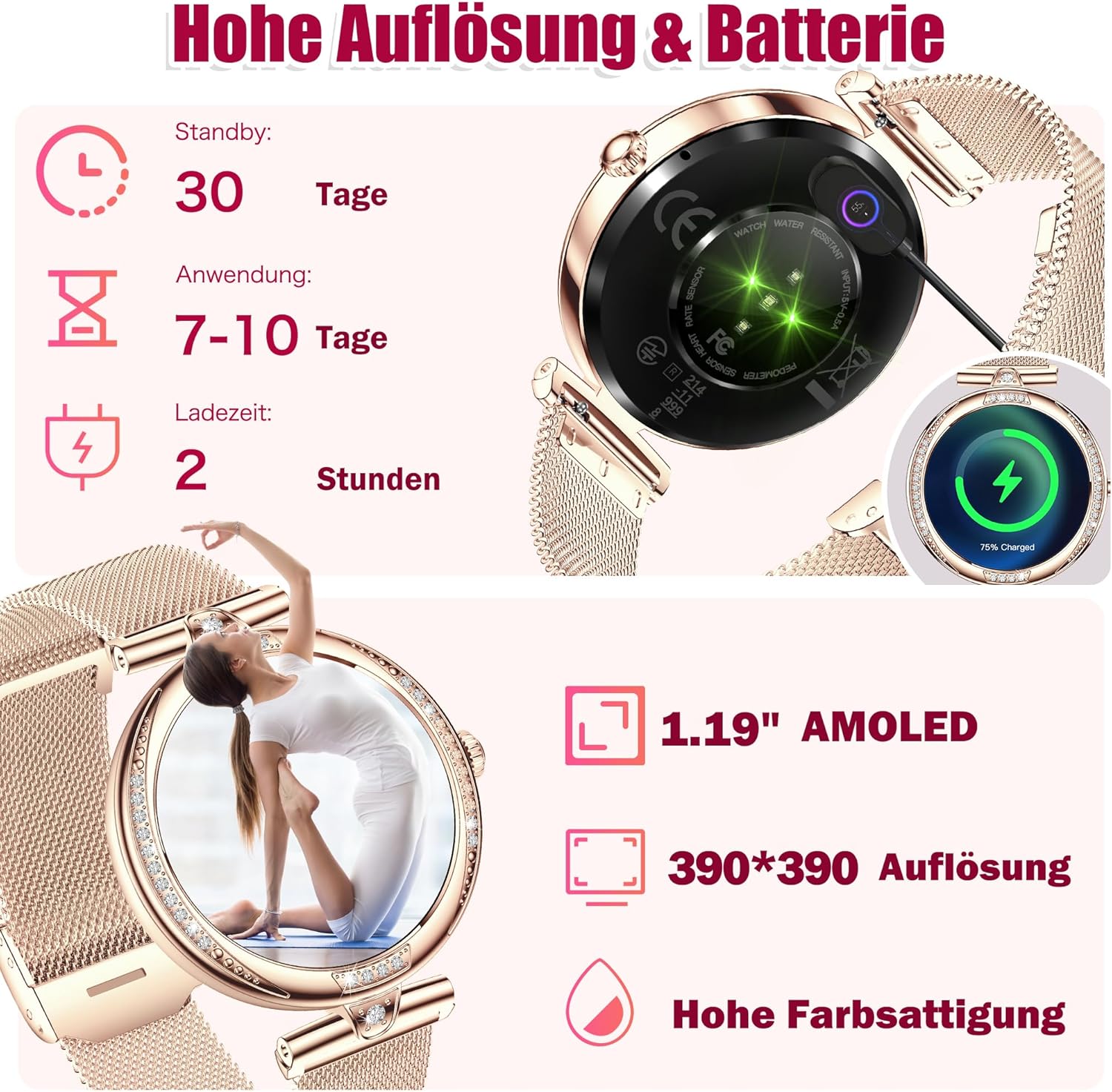 IP68 waterproof and 390 x 390 AMOLED touch screen and long service life: this smart watch can withstand sweat, accidental rain or water splashes, swimming, but is not suitable for bathing, or diving. Smartwatch has a 1.19 inch AMOLED touch screen, 390 x 390 HD resolution. Our smart watch is powered by a large capacity lithium battery. Charging takes only 2 hours, it can be used about 7-10 days and the standby time is up to 30 days.