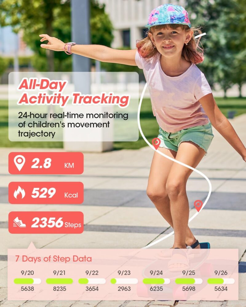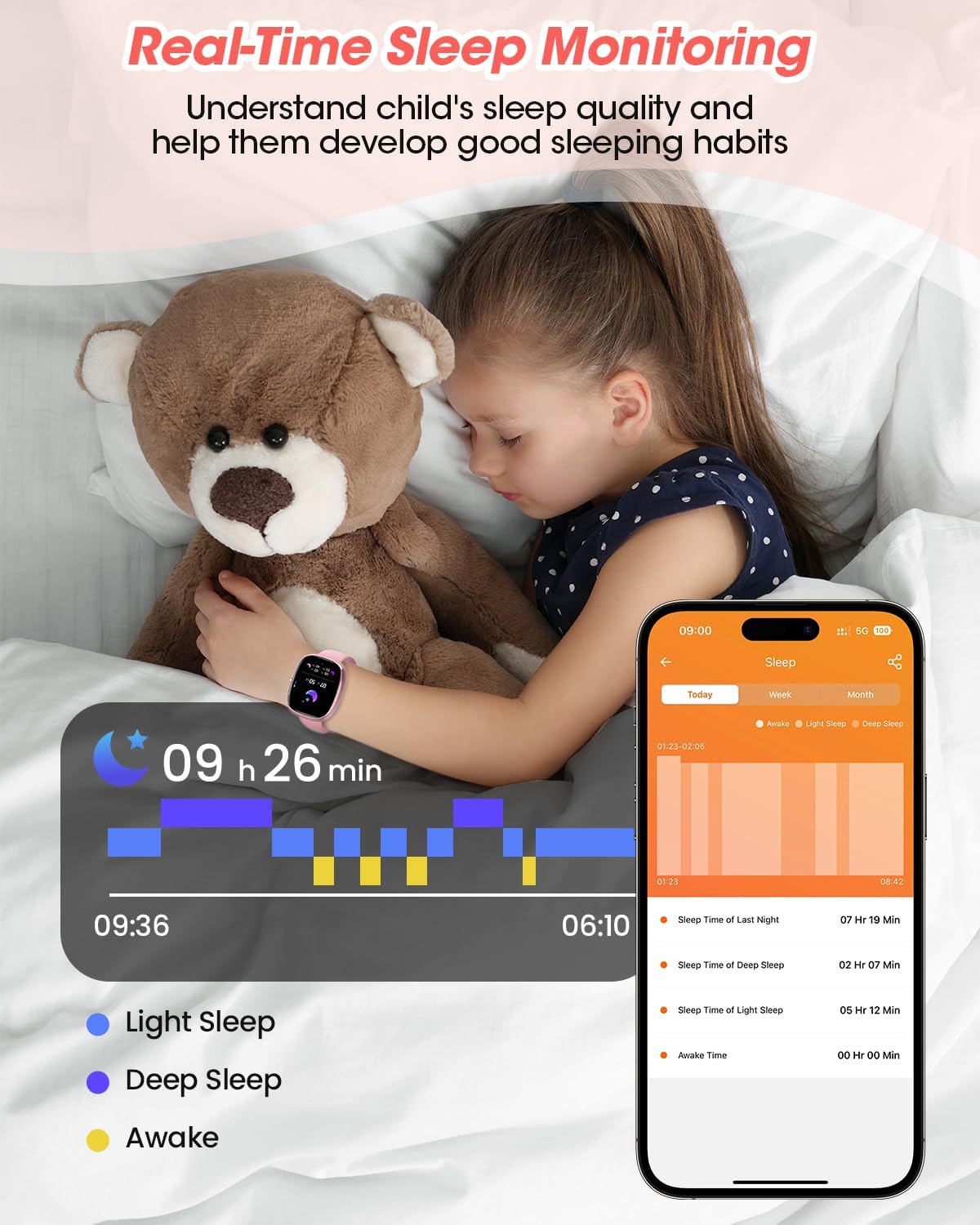 Healthy habits start here: these watches provide a sleep monitoring function that can comprehensively analyze the child’s sleep quality (deep sleep, light sleep, wake time) to help children develop a healthier lifestyle. Daily monitoring of heart rate and other data allows you to display health data directly on the children’s watch to better understand your child’s health condition.