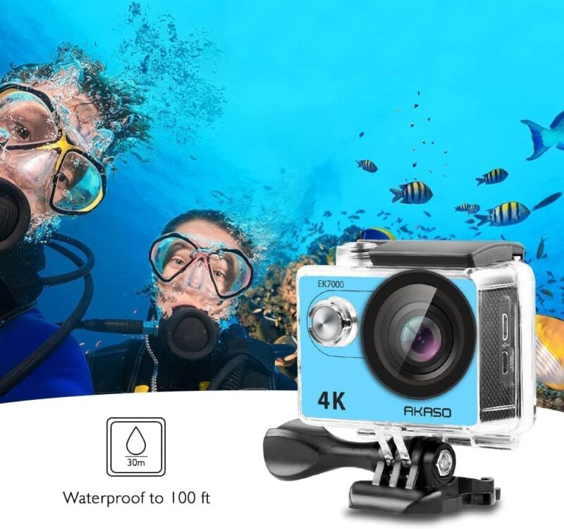 Waterproof and powerful. The AKASO EK7000 is designed for extreme environments. Equipped with a waterproof housing (IP68), you can take underwater shots up to 30 m depth. Ideal for outdoor activities, such as swimming, surfing, etc. The package also includes a 19-piece accessory set, which allows you to attach the camera almost anywhere.