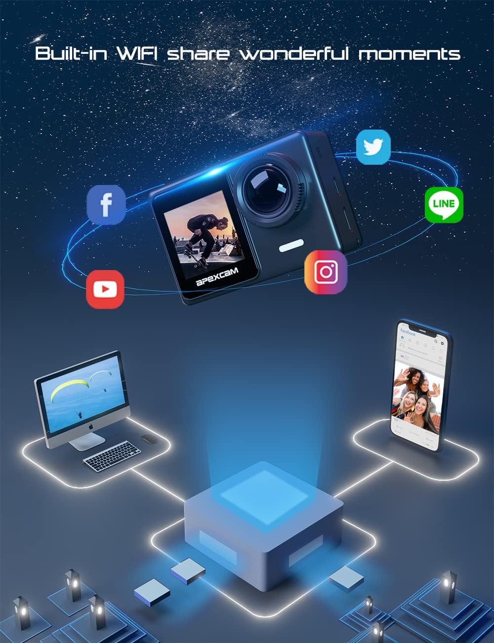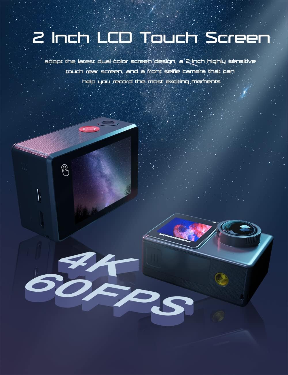 Dual displays and touch screen: This action camera has two screens, the front 1.3 inch LCD screen allows you to capture yourself without the help of others, while the rear screen, the touch screen, allows you to easily access vivid images.