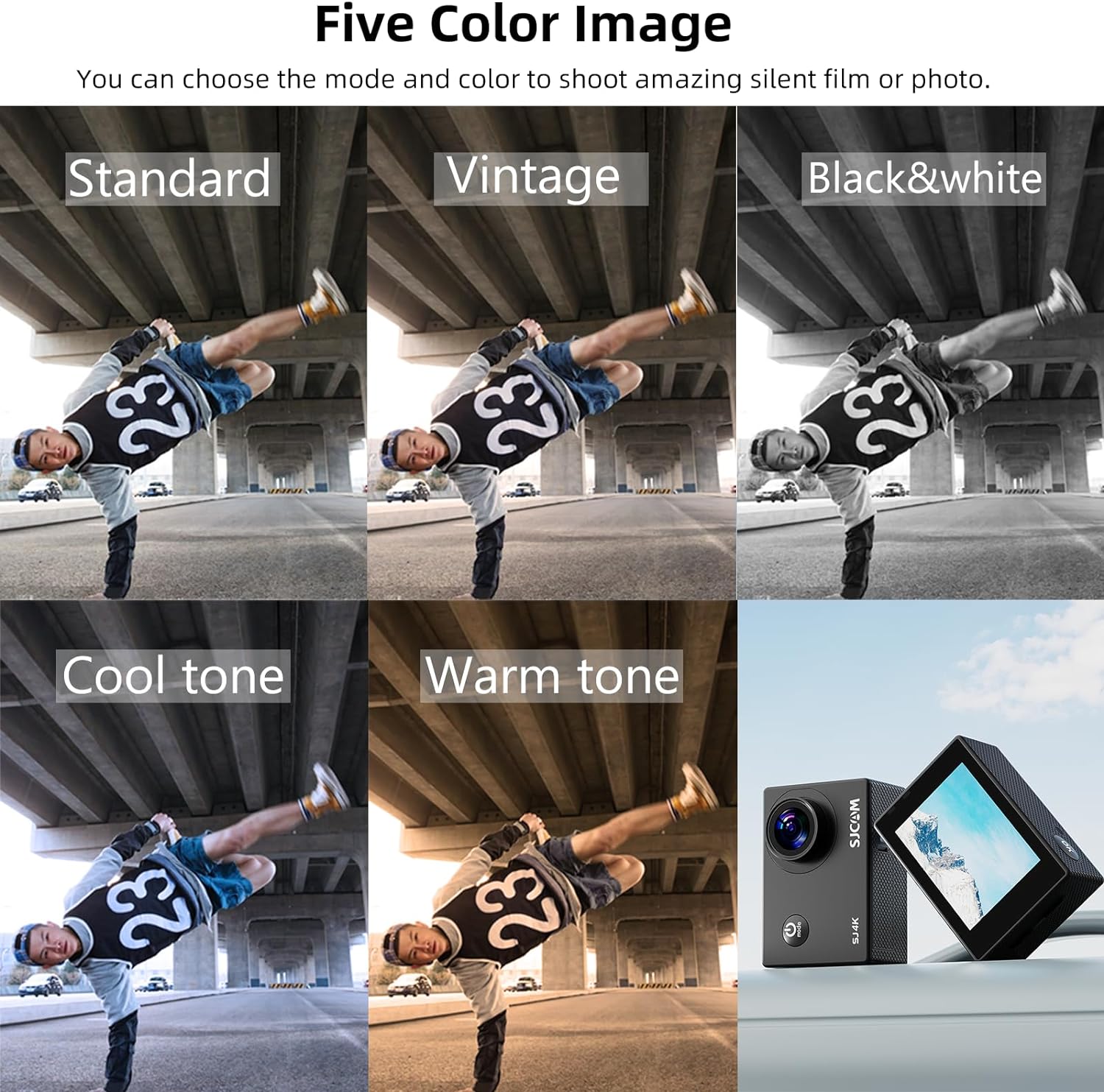 Multiple modes for use: SJCAM 4K action camera including loop recording, slow motion photography, driving mode, image flipping, time-lapse photo, exposure adjustment, white balance setting, etc. 2 inch LCD screen operating surface, larger font and clearer image. The effect of the camcorder will exceed your expectations.