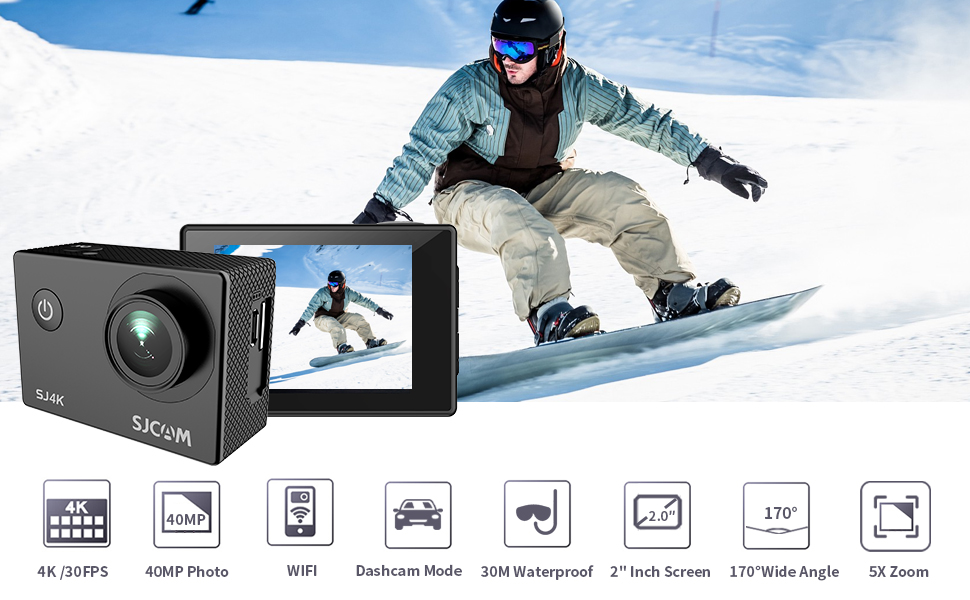 4K Ultra HD Action Camera: SJCAM SJ4000 supports 4K 30FPS/2K 30FPS/1080P 30FPS/720P 30FPS/WVGA 30FPS/VGA 30FPS video resolutions. has a zoom range from 1.0X to 5.0X, 40MP photos, 6G fisheye lens and 170° super wide angle to capture the exciting moment.