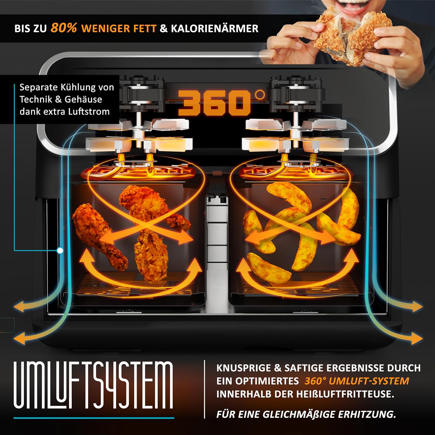 • Двузонен: Този хот еър фрайър има два отделни зони за готвене, което ви позволява да приготвите два различни ястия едновременно.