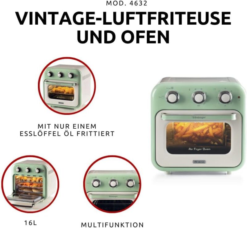 Еър Фрайър Ariete Vintage 4632 2-в-1 Хот Еър Фрайър 16L Зелен е изработен от висококачествени материали и е проектиран с голямо внимание към дизайна. Зелената му цветова схема ще добави стила и елегантността към кухнята ви.