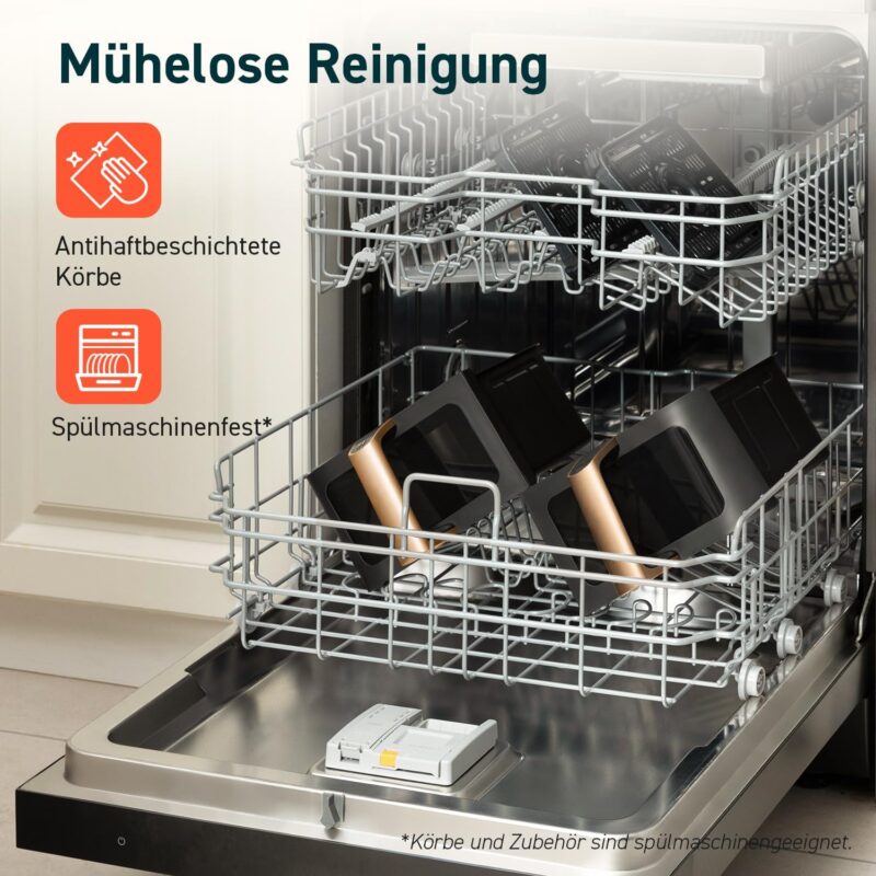 • Лесно почистване: еър фрайърът е оборудван с изнемаеми части, които могат да се измиват в съдомиялната машина.