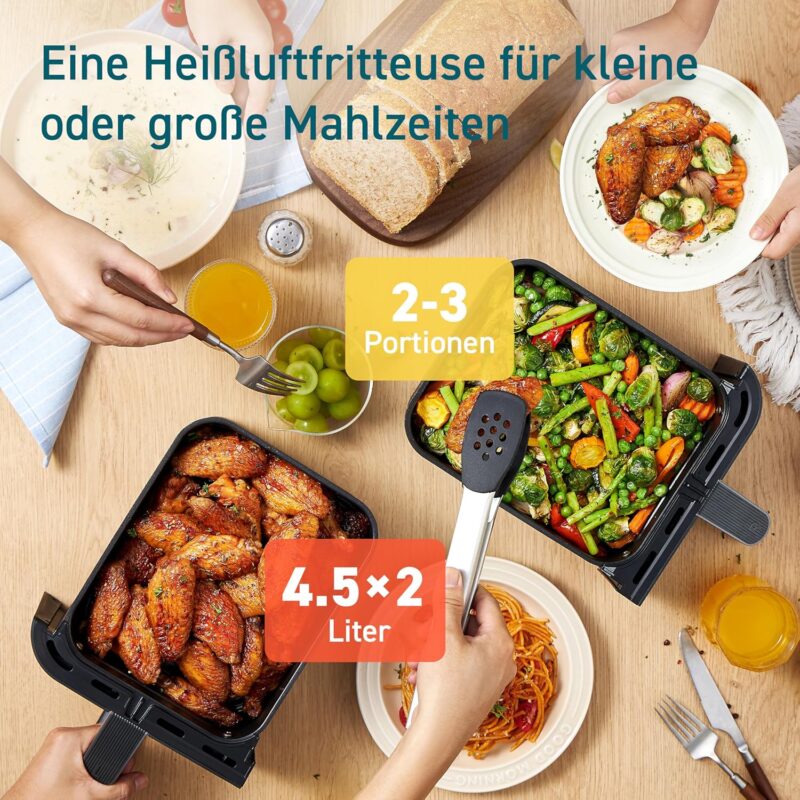 С Cosori CAF-R903 двузонен еър фрайър с капацитет от 8.5 литра, вие можете да готвите двата си любими ястия едновременно, без да се налага да използвате повече от една сковорода. Този иновативен уред ви позволява да готвите ястия с минимално количество мазнини, запазвайки всички вкусове и хранителни свойства на продуктите.