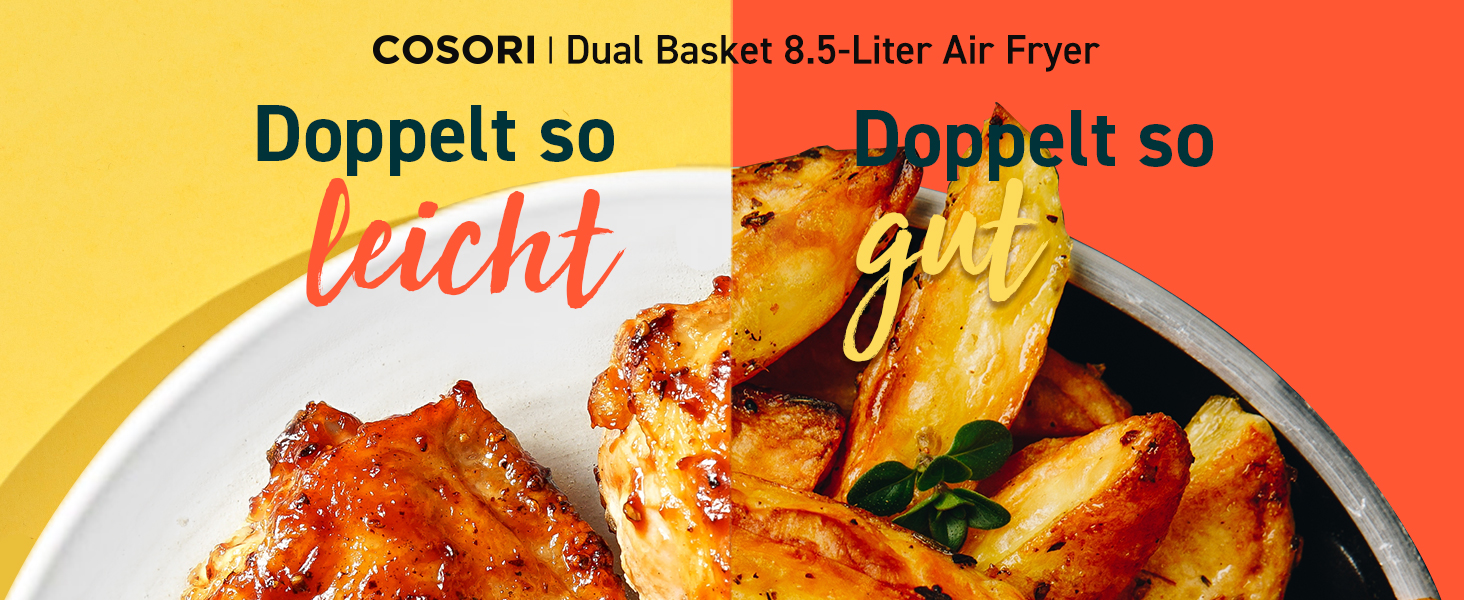 С Cosori CAF-R903 двузонен еър фрайър, вие ще можете да готвите здравословни и вкусни ястия, докато спестявате време и усилия. Изберете здравословния начин на готвене с Cosori!