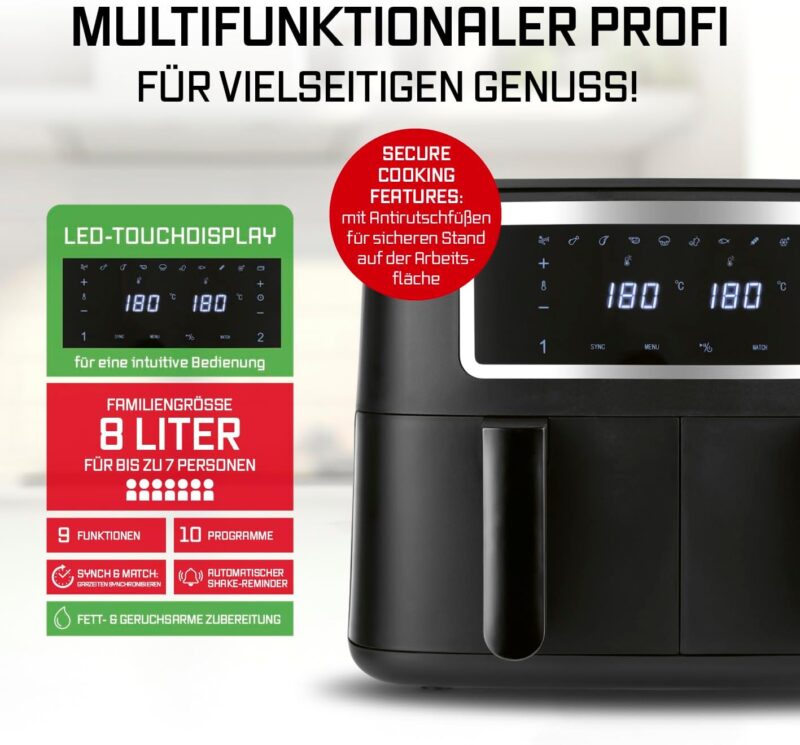 • Large capacity: The 8L capacity is ideal for families or entertaining, allowing you to cook a variety of dishes in one go.