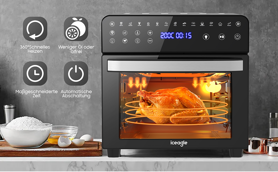 Еър Фрайър Iceagle Mini Oven Hot Air Fryer 15L е идеален за всеки, който търси здравословен и вкусен начин за готвене. С този продукт ще можете да се насладите на любимите си ястия, но с по-малко мазнина и калории.