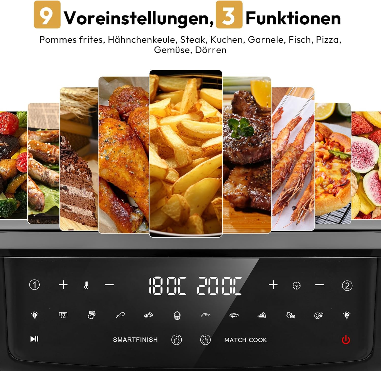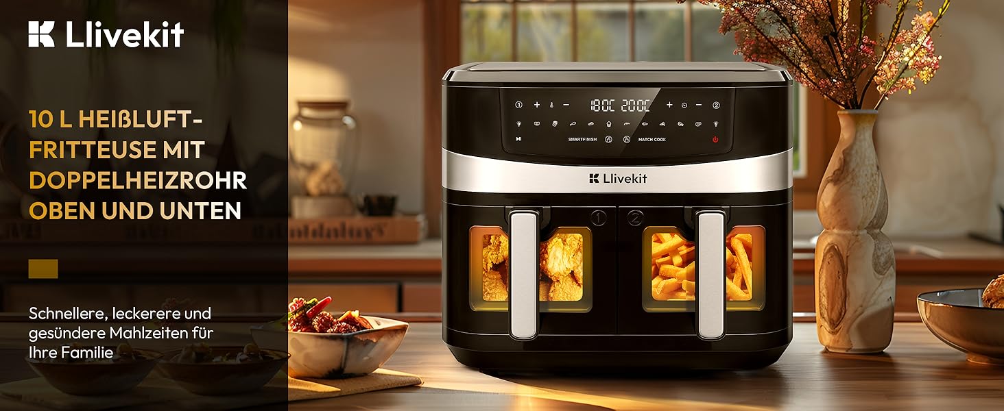 Открийте новия си начин на готвене с Еър Фрайър Llivekit Dual Zone Hot Air Fryer 10L, който ви позволява да готвите вкусни и здравословни ястия с минимално количество мазнини. Този уникален продукт е оборудван с две зони за готвене, които могат да работят едновременно, позволявайки ви да готвите две различни ястия едновременно.