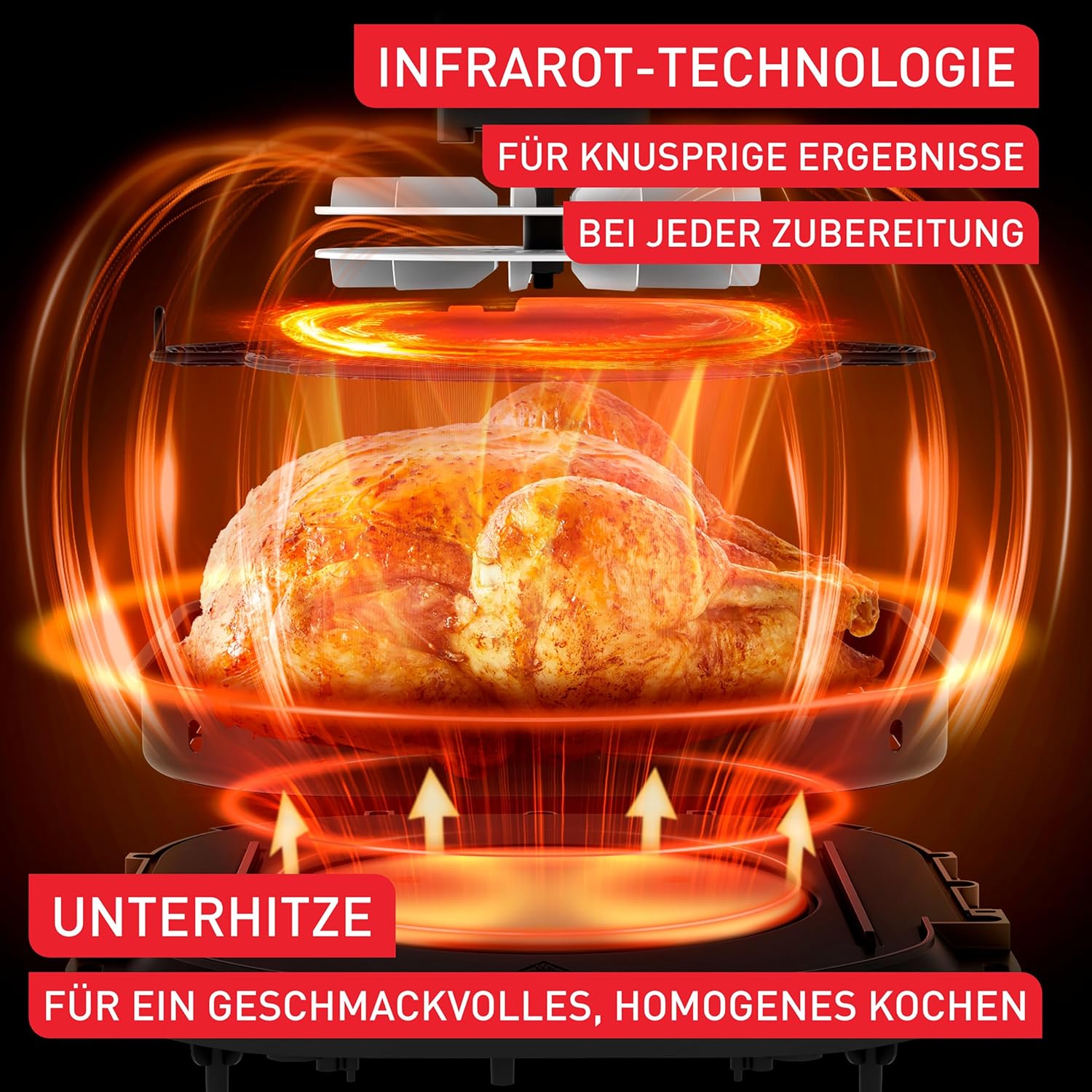 - Бързо и ефективно: готви храната бързо и равномерно, благодарение на мощния мотор и иновативната технология на горещ въздух.