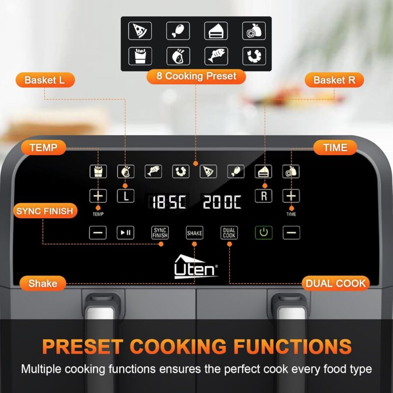 * Многофункционална: Еър Фрайър Uten E1905 може да се използва за готвене на разнообразни ястия, включително френски картофи, пържени храни, печени храни и много други.