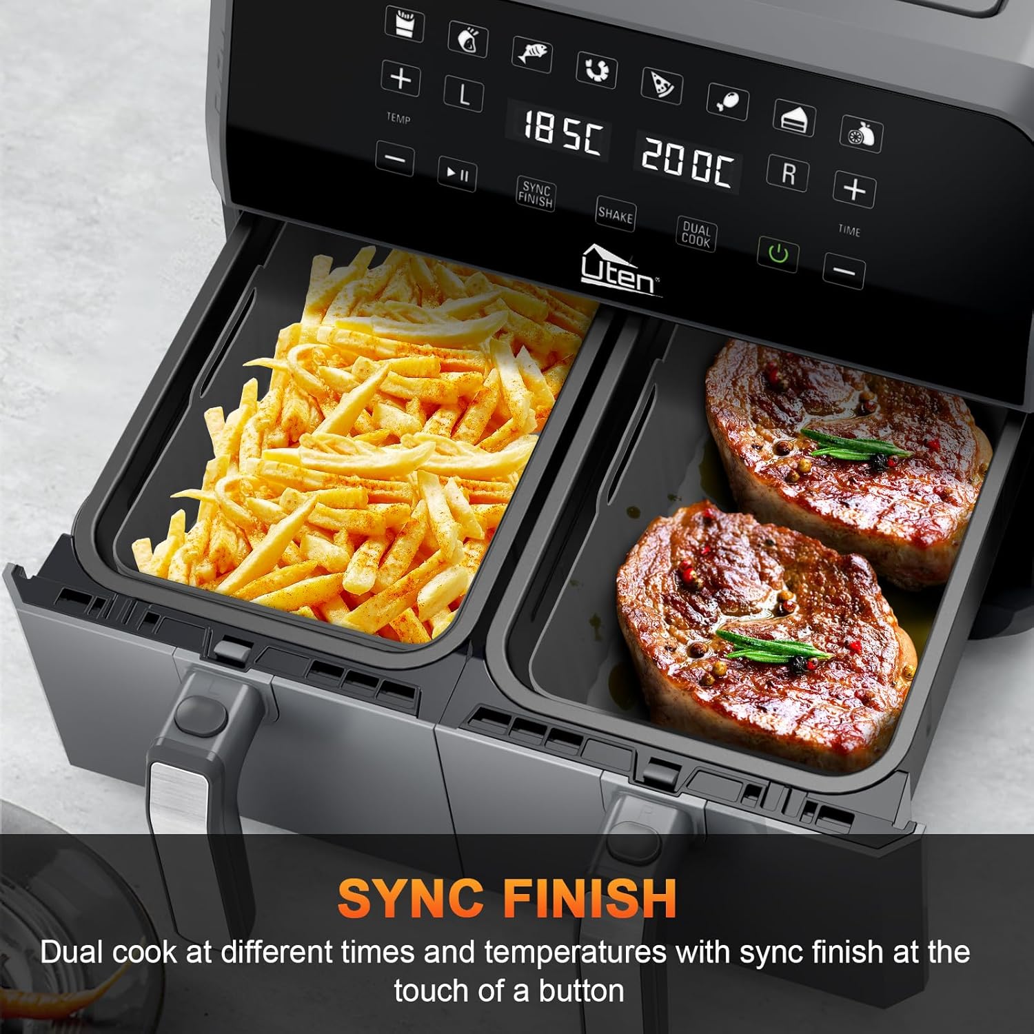 Въведете се в новия свят на храни с Еър Фрайър Uten E1905, двузонова фритюрка с горещ въздух от 8 литра. Този иновативен продукт позволява да готвите вашите любими ястия с до 50% по-малко мазнини, в сравнение с традиционните фритюрки.