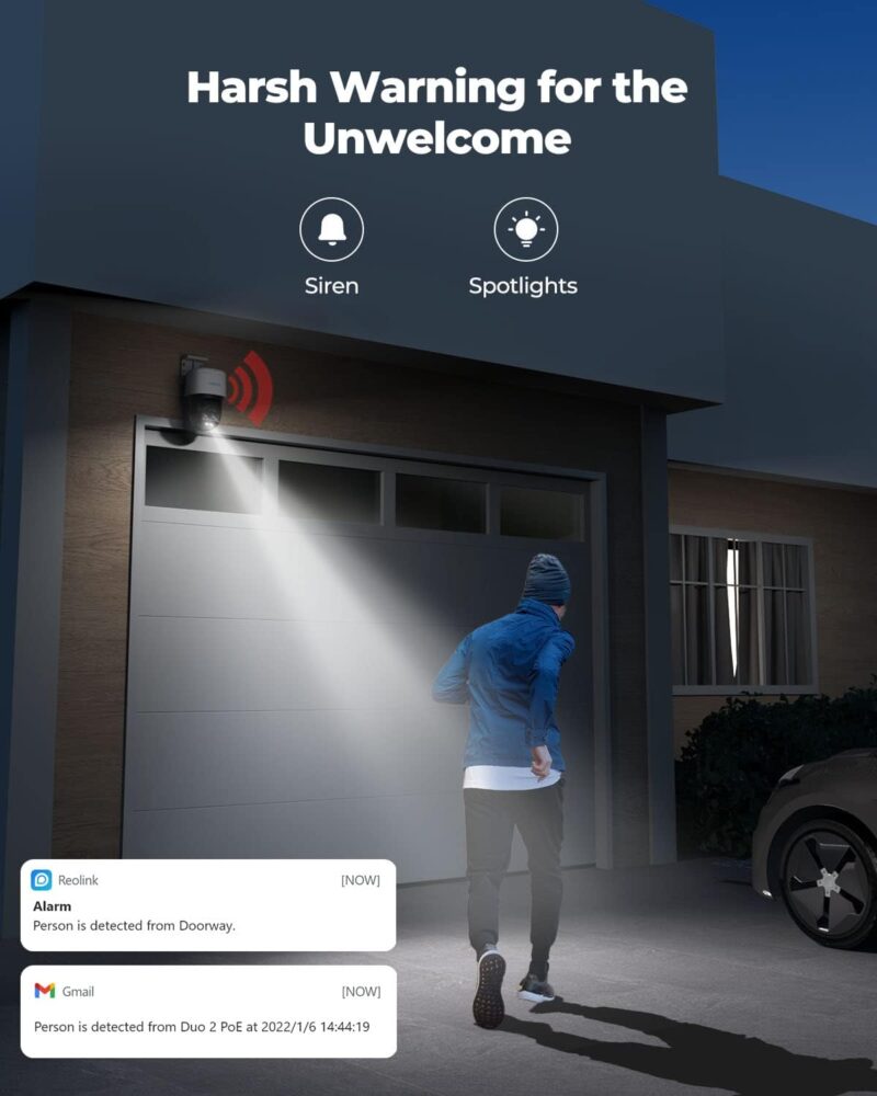 INSTANT ALERTS: Once any suspicious motions are detected, spotlights and sirens will be triggered, and push/email notifications will be sent to your device. Feel safe all the time.