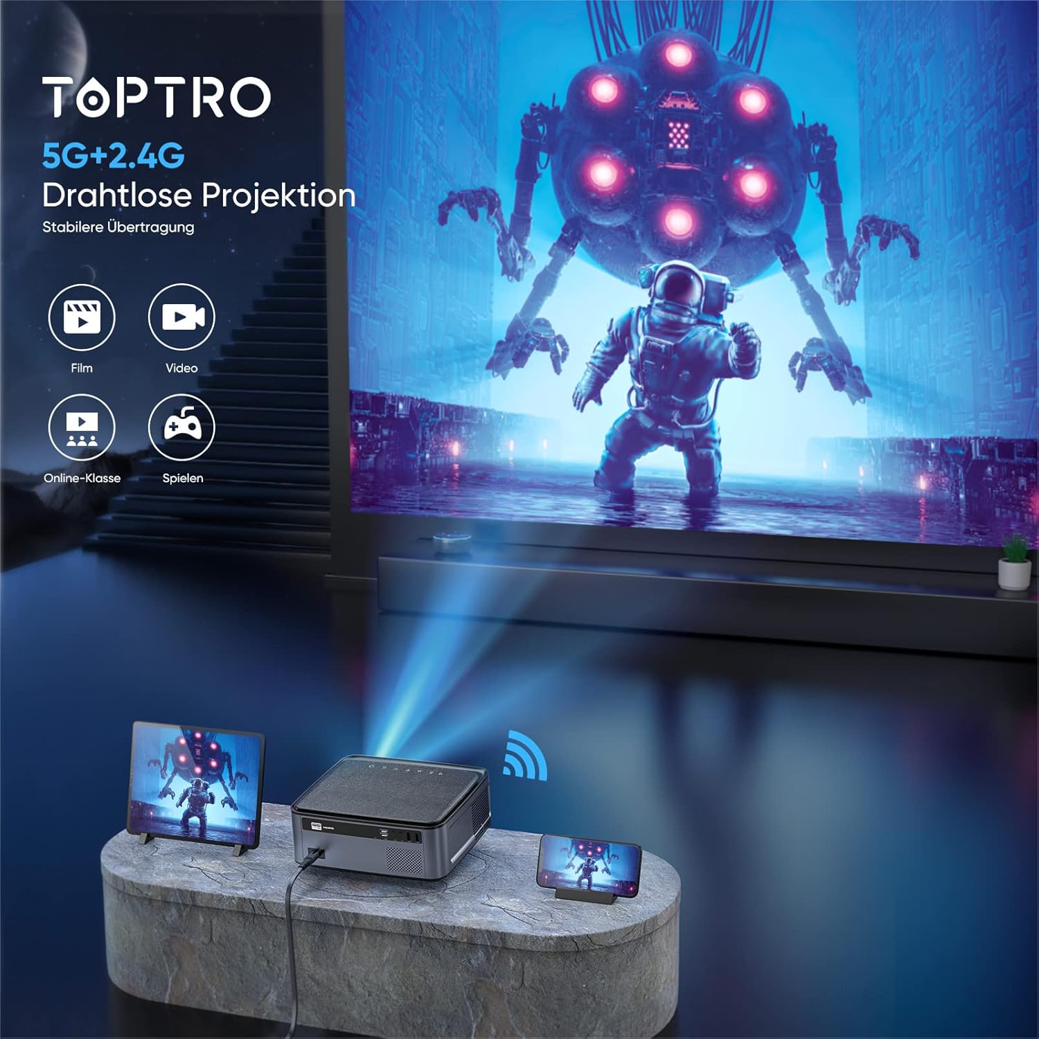 5G / 2.4G wireless connection and 350 inch large screen: the updated projector supports 5G / 2.4G dual band WiFi wireless connection in Android/iOS smartphones. With the help of a large screen that can throw up to 350 inches, zoom -50% function. There is also the latest 5g WiFi connection technology, you can enjoy live sports with extremely low latency and an unparalleled immersive gaming experience.