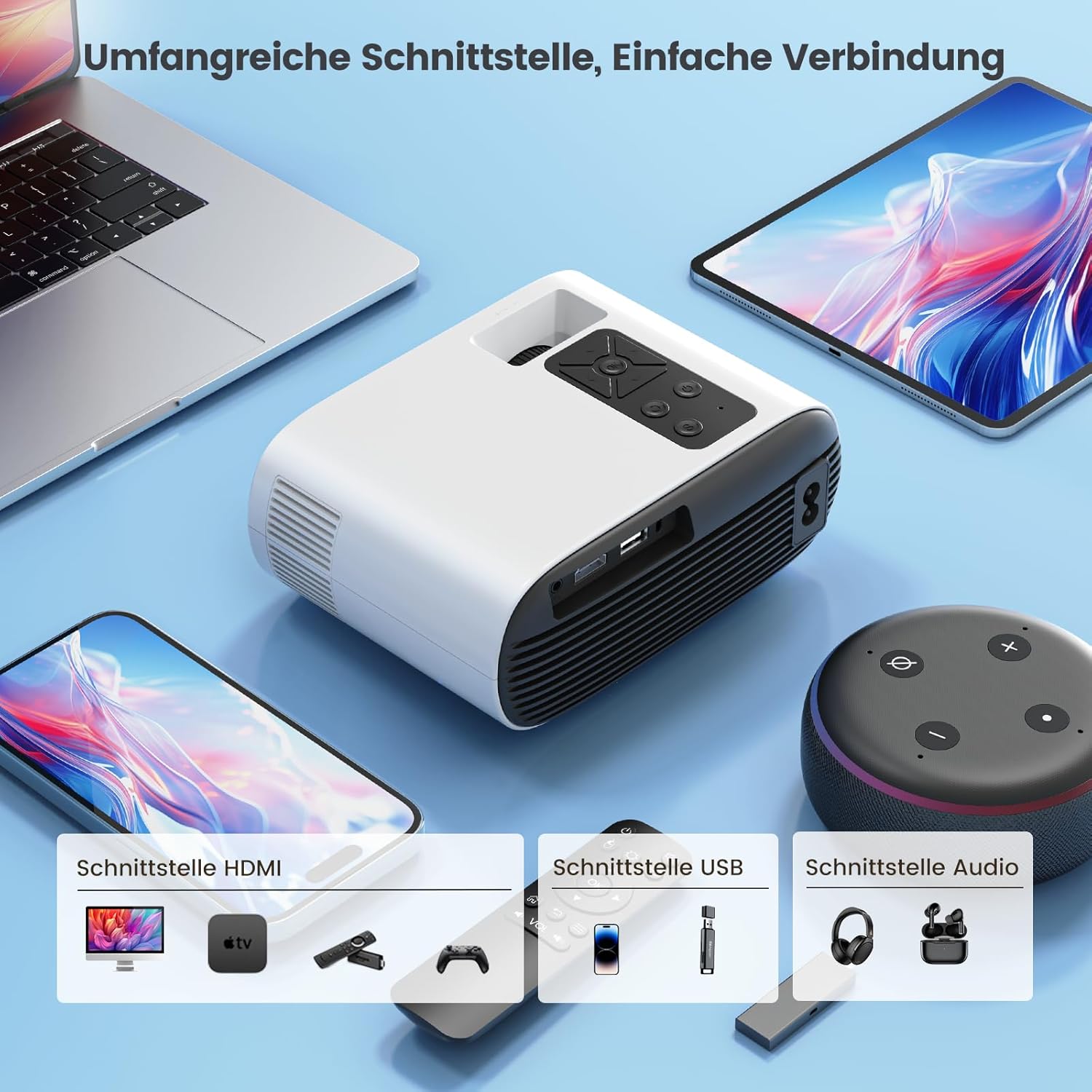 Multi-device connection: This mini projector home cinema is equipped with HDMI, USB and 3.5 mm audio ports that allow it to be easily connected to your mobile phone, laptop, PC, TV stick, etc. This mini projector Full HD is perfect for home cinema, night camping outdoors, etc.