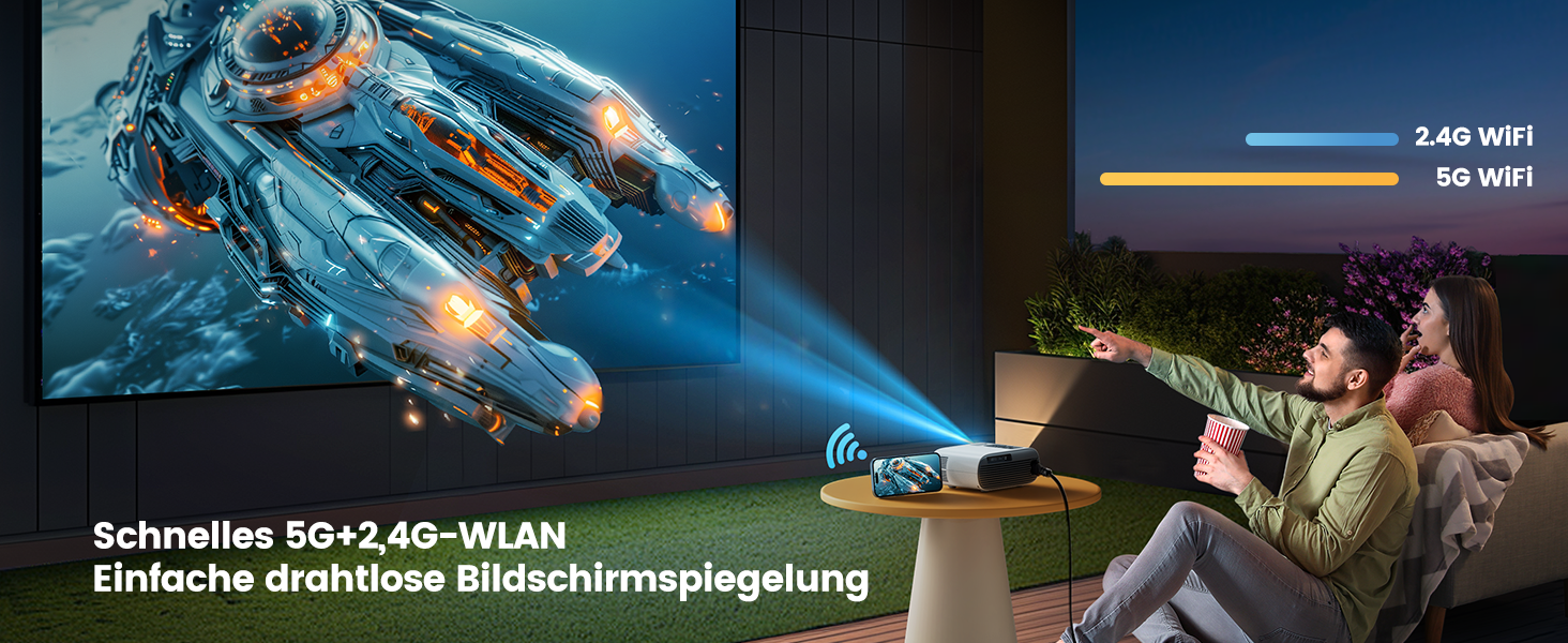Faster 5G WiFi | Bluetooth 5.2: The TR26 mini projector uses 2.4G/5G WiFi technology, which provides faster and more stable transmission and is compatible with wireless connections from iOS, Android, tablets and other devices. This mini projector also supports wired screen mirroring. The projector has built-in stereo speakers and you can also connect it to Bluetooth headphones and Bluetooth speakers via the Bluetooth function.