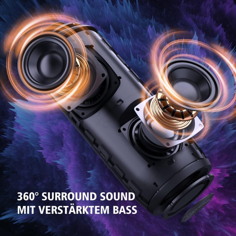 Real 360° stereo sound: Stereo sound with insanely good all-round sound – the Bluetooth speakers deliver an impressively powerful sound, mid and highs, dynamic sound. Even at maximum volume, without annoying noise, just like a live concert performance. Perfect for outdoor and indoor use: family, beach, camping, driving, fishing. n,swimming pool garden and more.