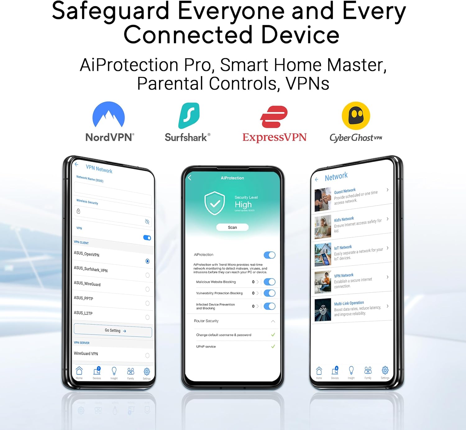 Router with subscription-free network security: AiProtection Pro powered by Trend Micro ensures premium security at no additional cost, including one-tap security scanning and safe browsing
