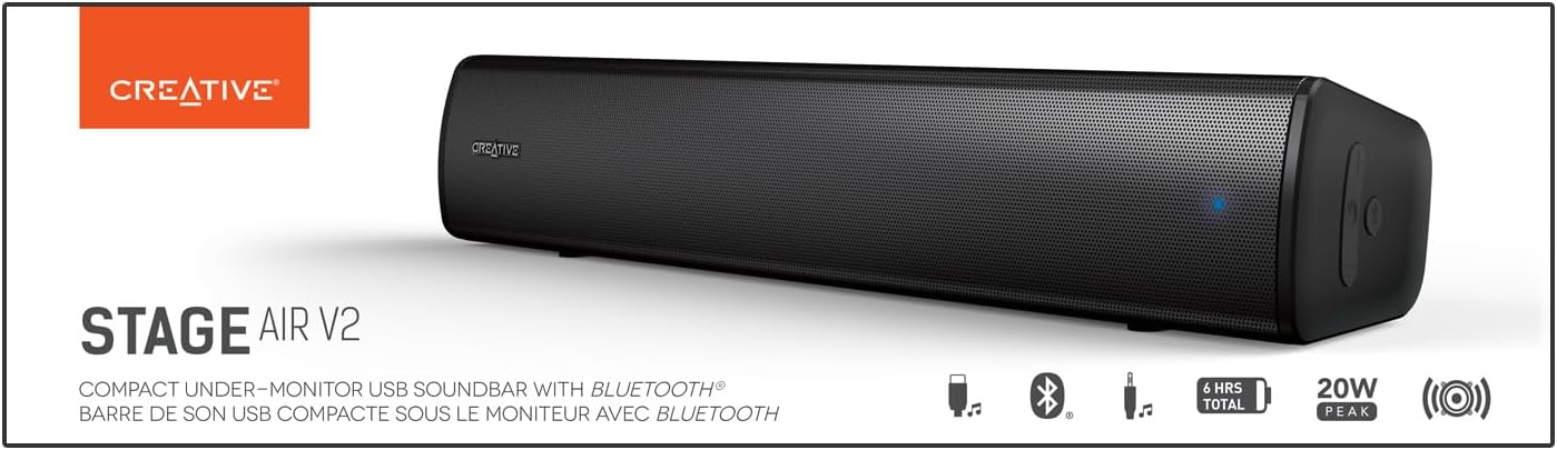 Търсите ли си начин да преобразите звука на вашия компютър в пълноценен звуков опит? Саундбарът CREATIVE Stage Air V2 е това, което търсите! Този компактен звукобар е проектиран да предостави на потребителите си пълно звукова изживяване, като комбинира висококачествен звук с удобство и функционалност.