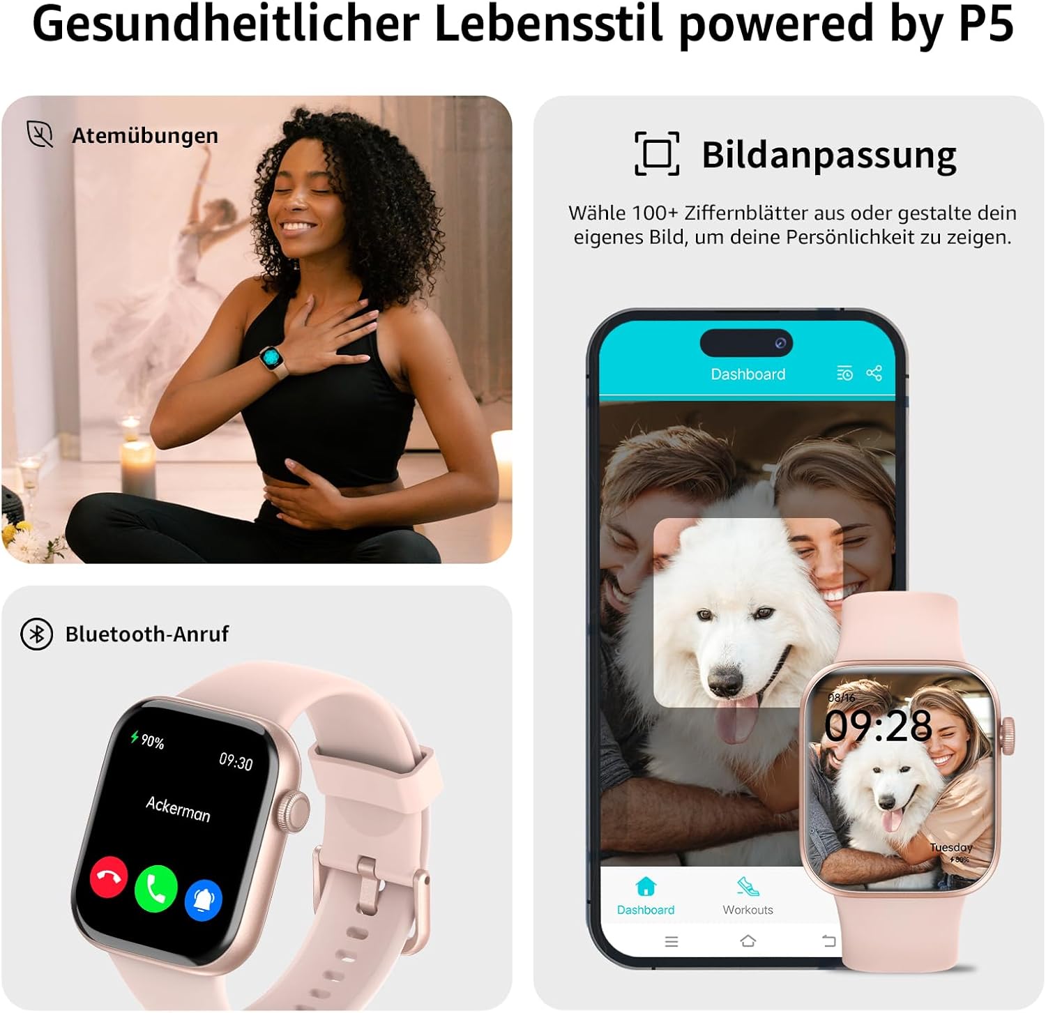 Music players and other practical gadgets: The built-in speaker allows you to listen to music directly via the smartwatch and get lost in the music. The AcclaFit men’s P5 smartwatch offers other practical functions such as tracking the female cycle, voice assistant, torch, calculator, calorie monitor, pedometer, alarm, stopwatch, lack of movement reminder and weather display, remote control of the camera, etc.