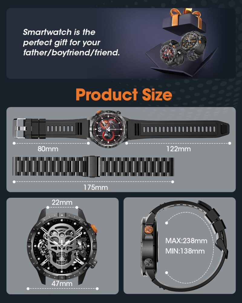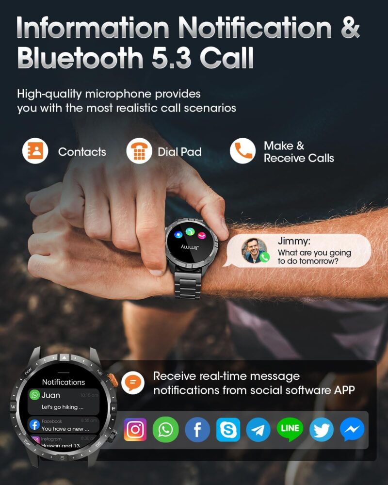 STABLE BLUETOOTH: Smartwatch for men with Bluetooth 5.3 technology for a faster and more stable connection experience. Answer or reject calls with one click and stay connected anytime, anywhere. At the same time, you can receive message reminders from Facebook, Instagram and other social media, so you don’t miss any important information.