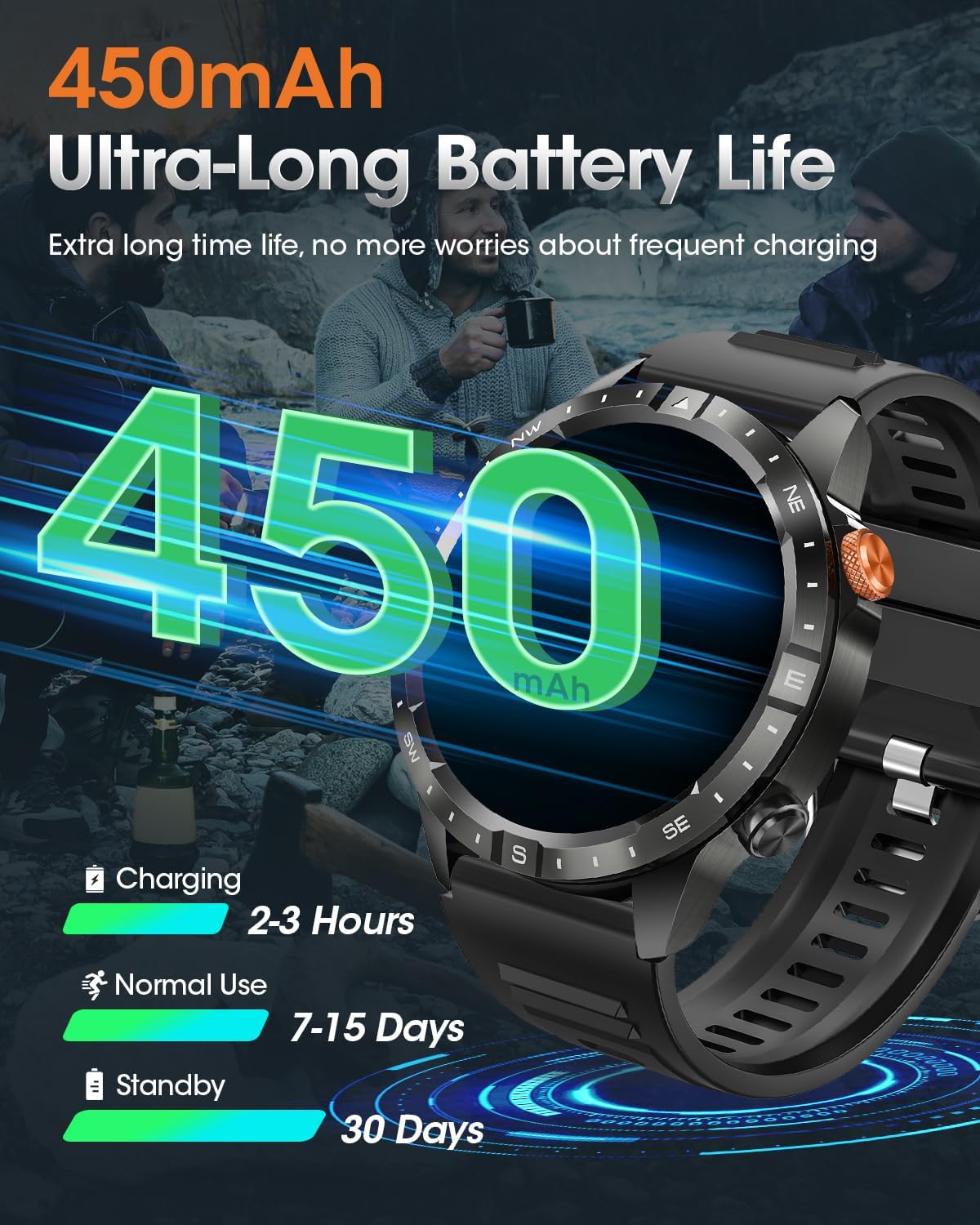 The watch for men is equipped with a 450 mAh battery with high capacity and low power consumption, which only takes 2-3 hours to charge, can last 5-10 days and 30 days on standby. You no longer have to worry about frequent charging affecting the user experience. This smart watch is compatible with Android and iOS systems. More colourful features are waiting for you to discover.