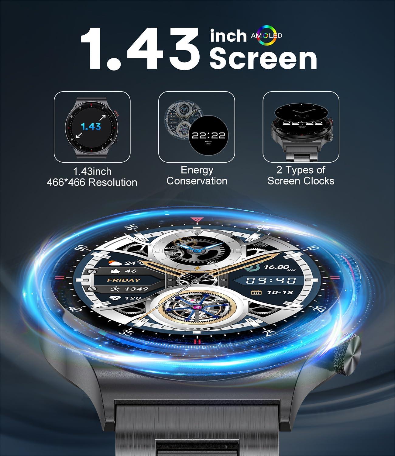 1.43-inch HD Amoled touchscreen and 200+ Custom Dials DREMAC amoled smartwatch features a 1.43-inch color touchscreen that offers ultra-clear images and a comfortable user experience. Swipe the screen left, right, up and down to access the functions area, allowing you to quickly select the most frequently used functions. The watch app offers over 200 elegant dials as replacements, you can also upload your favorite photos as custom dials and long-press the screen to quickly switch from one dial to another.
