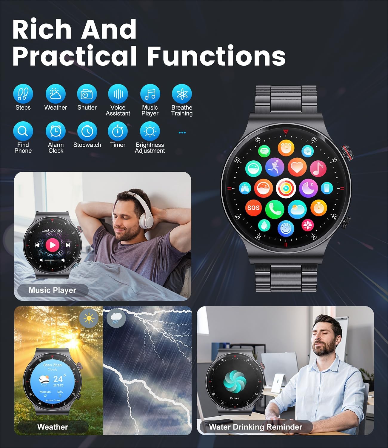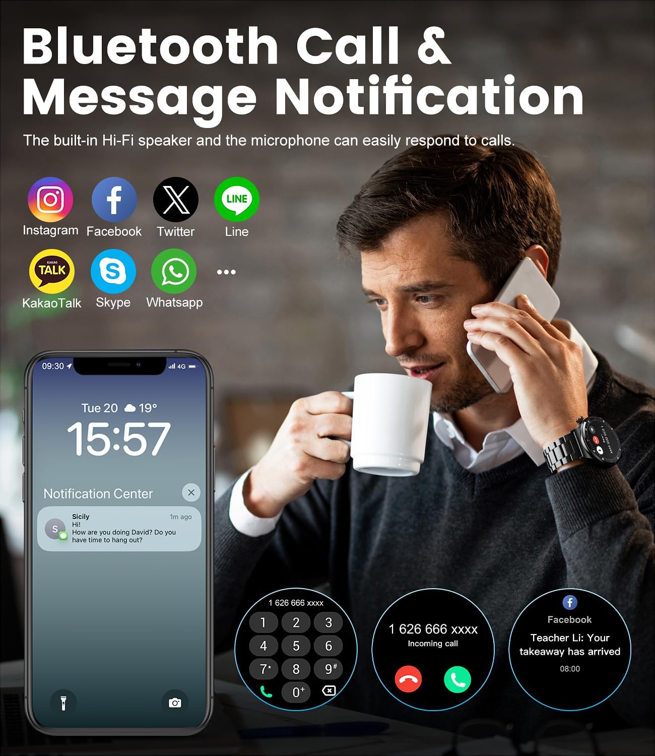 Bluetooth Calls with Voice Assistant The smartwatch for men features Bluetooth 5.3 technology to maintain a stable connection and Bluetooth calls. So you can make calls on your smartwatch anywhere, anytime, with clearer, more consistent sound quality. This connected watch also lets you dial numbers, change music, check the weather and much more thanks to the voice assistant. It can also receive messages from mobile applications such as SMS, Facebook, INS, YouTube, WhatsApp and many more.