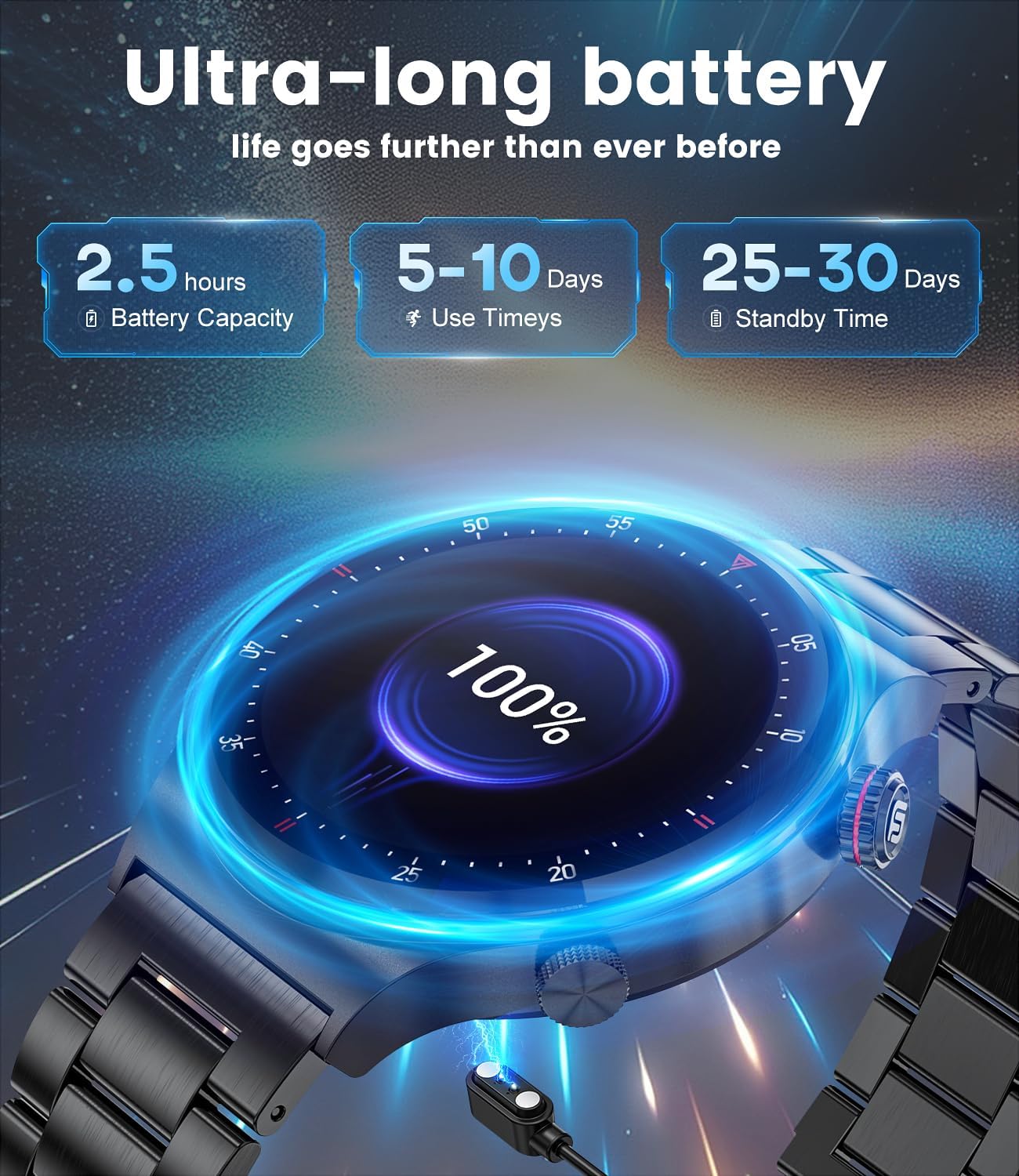 Over 30 days standby time on a two-hour charge The mens smartwatch is equipped with a Seiko low-energy consumption battery for extremely long standby time. With a fast magnetic charging system that guarantees 7 to 10 days of use and 30 days of standby time on a 2-hour charge, the watch offers long standby time without the need for frequent recharging.