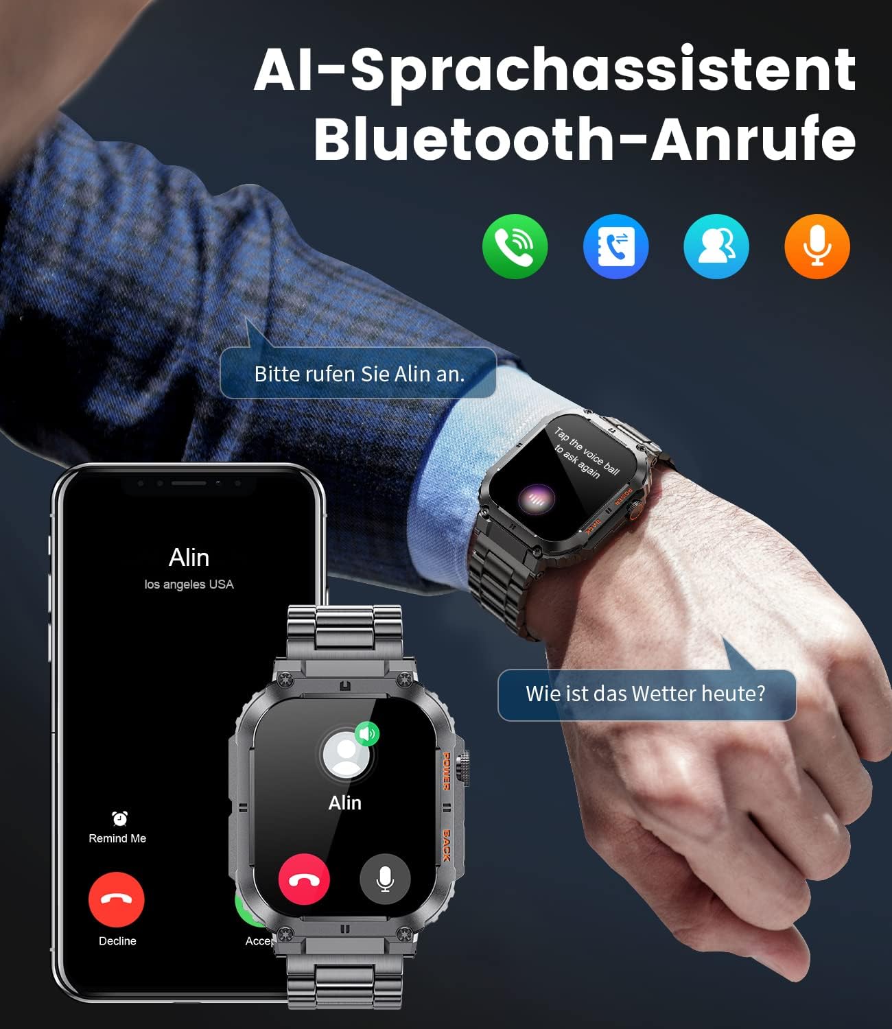 Military standard check and 5 ATM waterproof: special composite materials and metal shell allow our smartwatch for men to pass ten standard tests, including shock test, low temperature test, vibration test, rain test, salt spray test, fungus test, contamination by liquid test, sand and dust test, solar radiation test, etc. Fitness watch can undoubtedly become your reliable companion if you like outdoor activities.