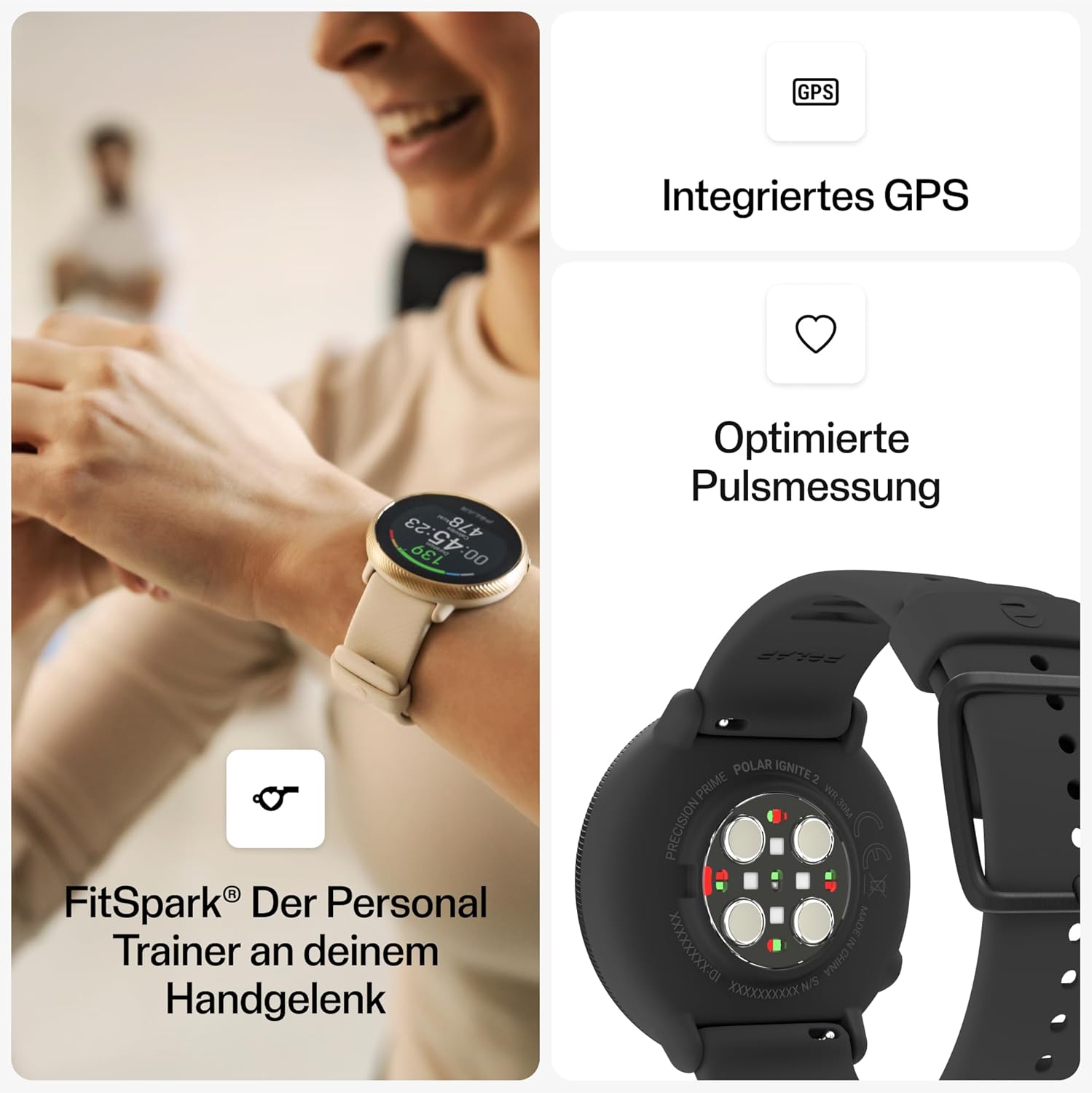 The ideal companion, not just for fitness training: The Polar Ignite 2 is an eye-catcher in the gym, during group training, swimming, running, cycling, walking, yoga and is a stylish companion in the office and during leisure time.