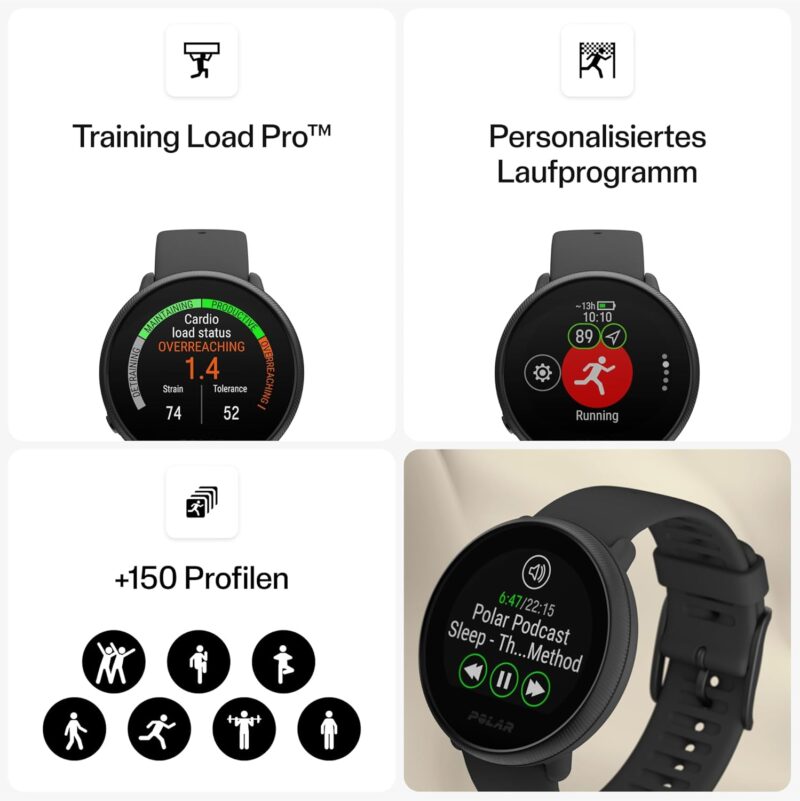 Technology to stay fit: Built-in GPS, pulse measurement on the wrist, long battery life, running program, FitSpark daily training instructions, Nightly Recharge.