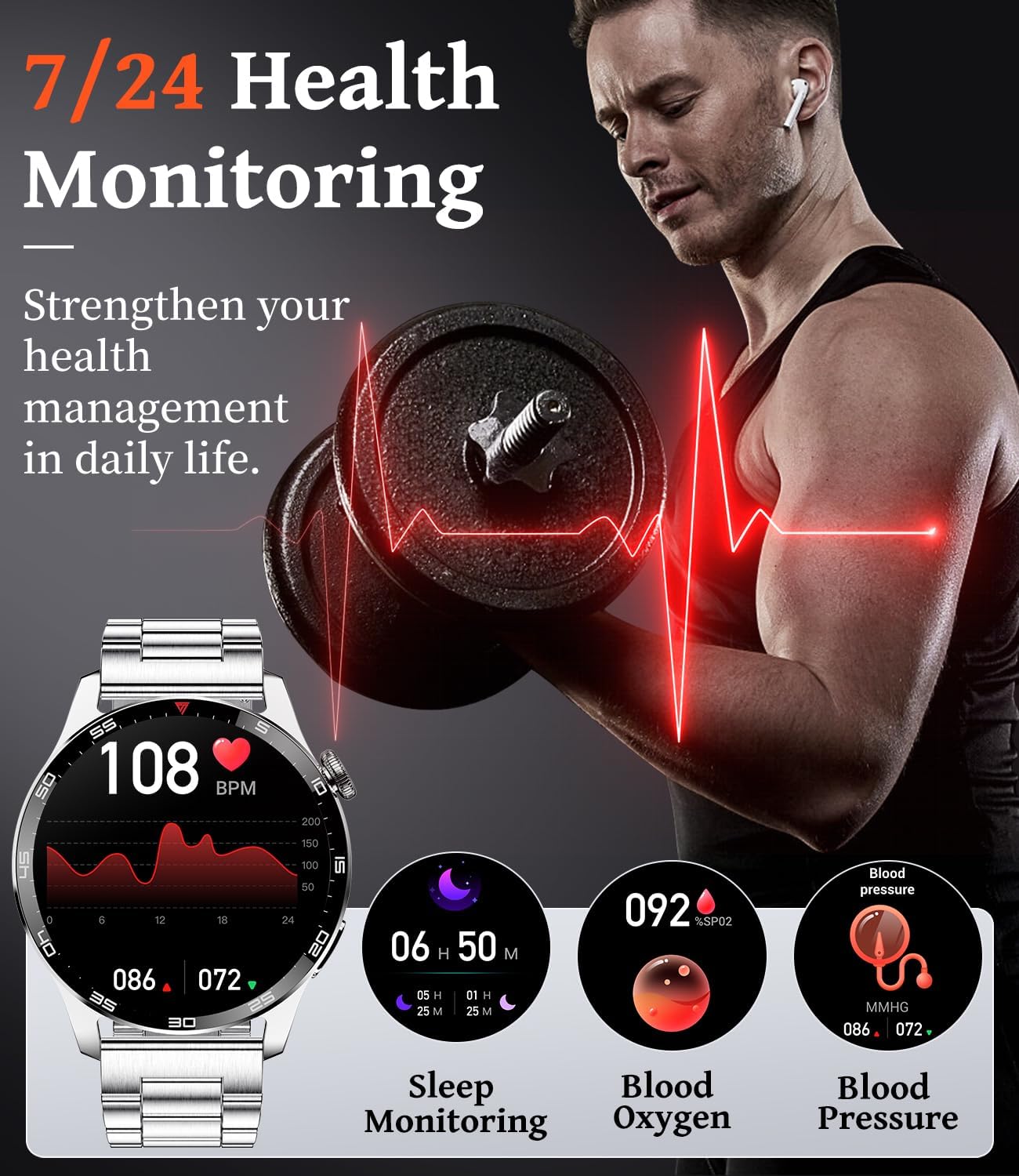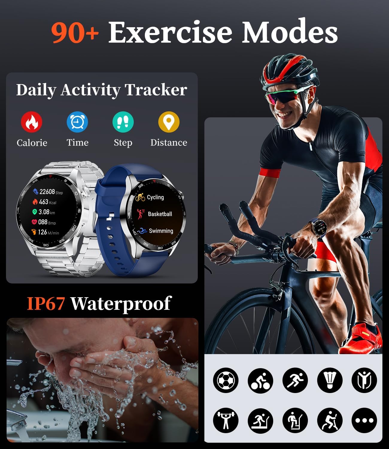 Over 100 sports modes and IP68 waterproof: expand your fitness journey with our smart watch for men, which provides support for over 100 sports modes both indoors and outdoors, including activities such as walking, cycling, hiking, yoga, swimming and more. You have the flexibility to choose between these modes or even add new ones via FitCloudPro to enable customized training plans and precise sports data tracking. The watch is also waterproof with IP68 rating, which ensures safety.