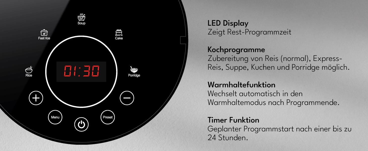 • Многофункционален: Освен приготвяне на ориз, уредът може да се използва и за приготвяне на други ястия, като например яхния, супи и още.