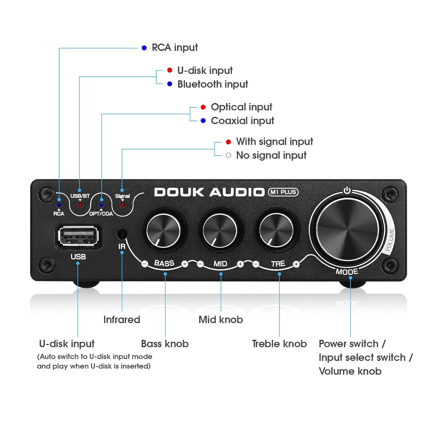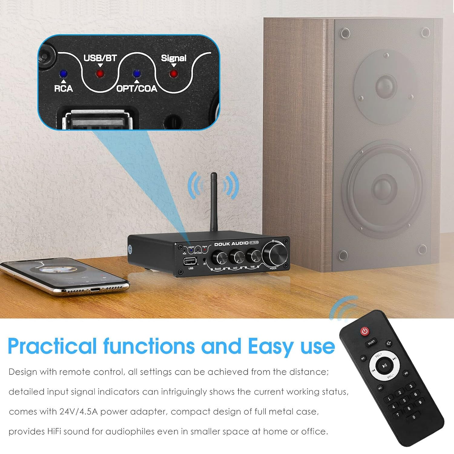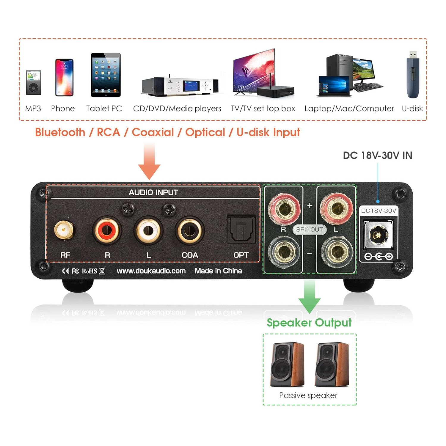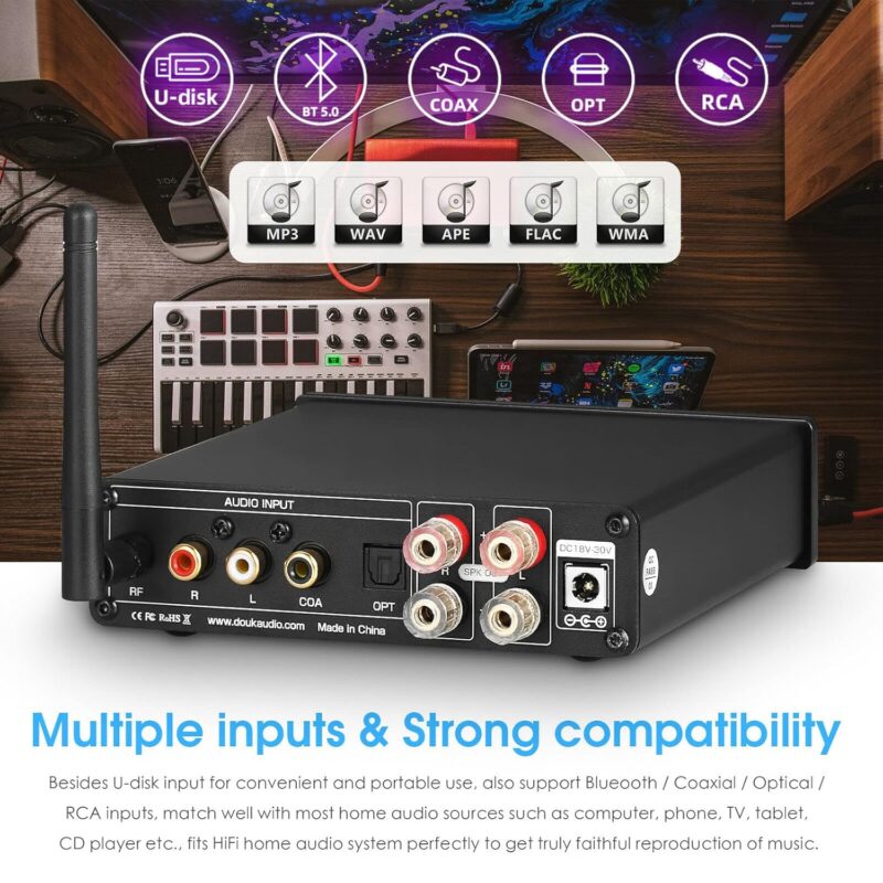 Multiple Input Sources & Strong Compatibility: In addition to the practical and portable U disk input, the amplifier supports Bluetooth/Coaxial/Optical/RCA inputs and is almost perfectly compatible with most home audio sources such as computer, phone, TV, tablet, CD player, etc. It adapts perfectly to HiFi home audio systems for truly faithful playback of the music.