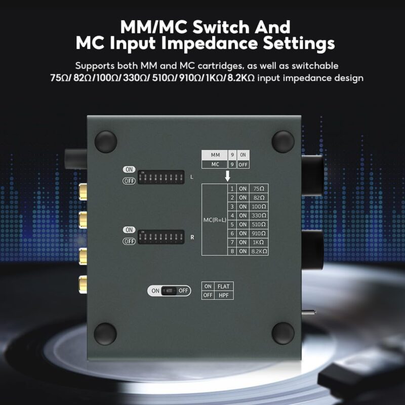 Adjustable Impedance Settings: There are eight variable input impedance settings available to adapt to any MC pickup (not suitable for MM pickups). This provides customers with a wide range of options and the ability to change the sound signature to their liking.