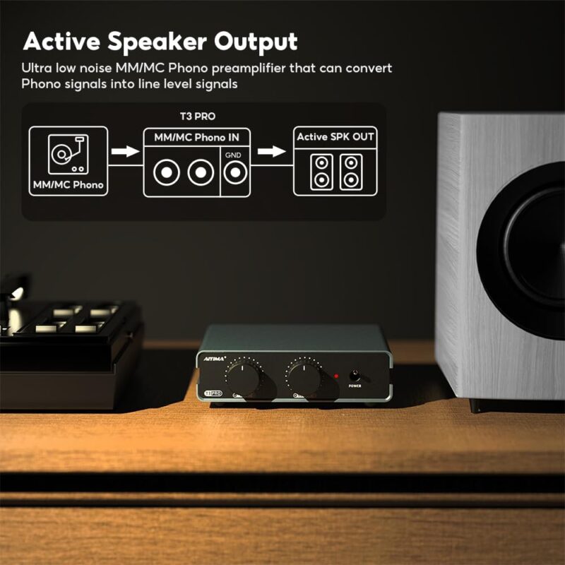 PROFESSIONAL PHONOGRAPH PREAMPER AIYIMA T3 PRO MM phono preamp only supports MM/MC phono single input (other audio signal inputs are not supported). The T3 PRO’s RCA audio signal outputs can be routed to an active speaker or home audio amplifier.