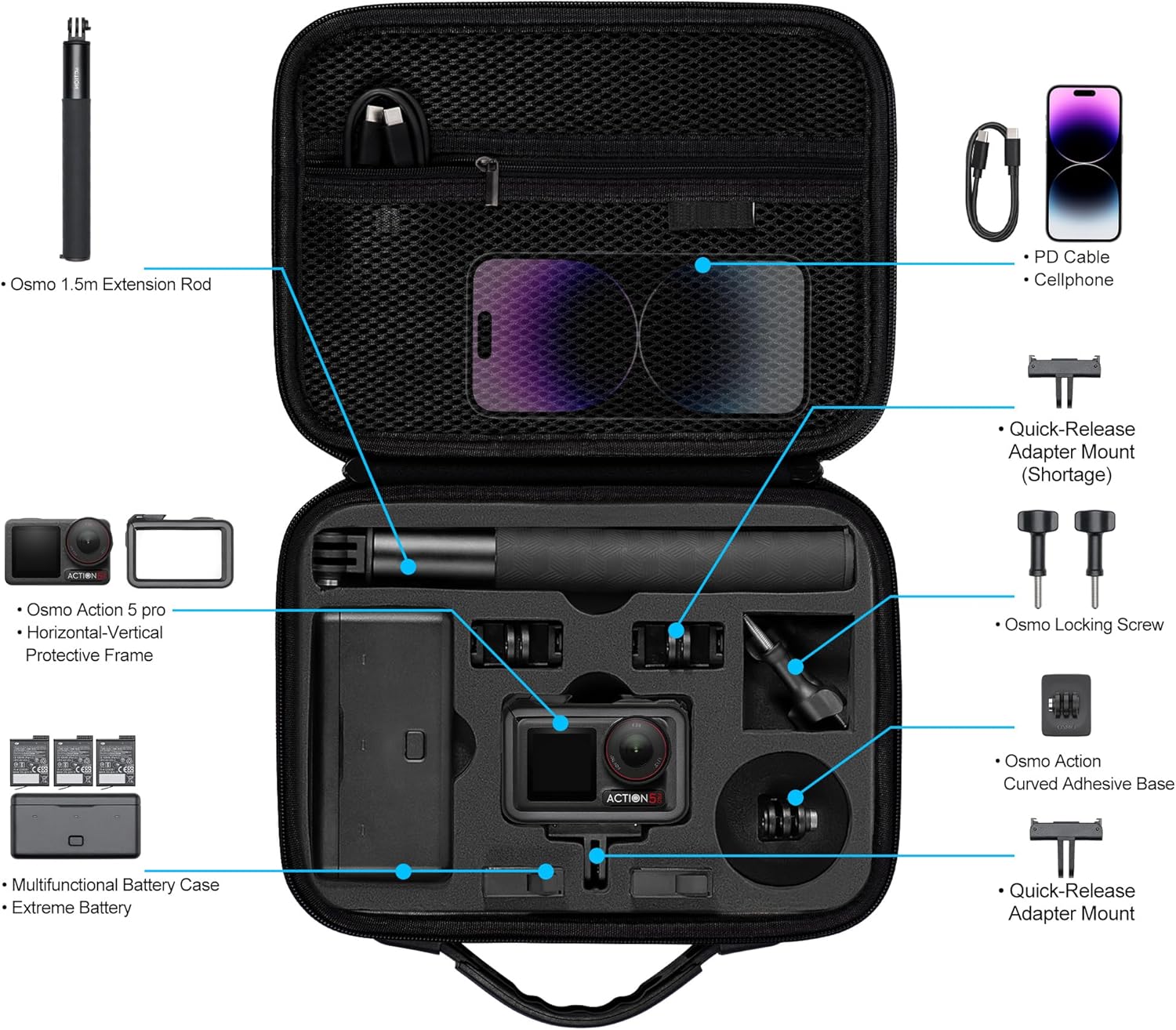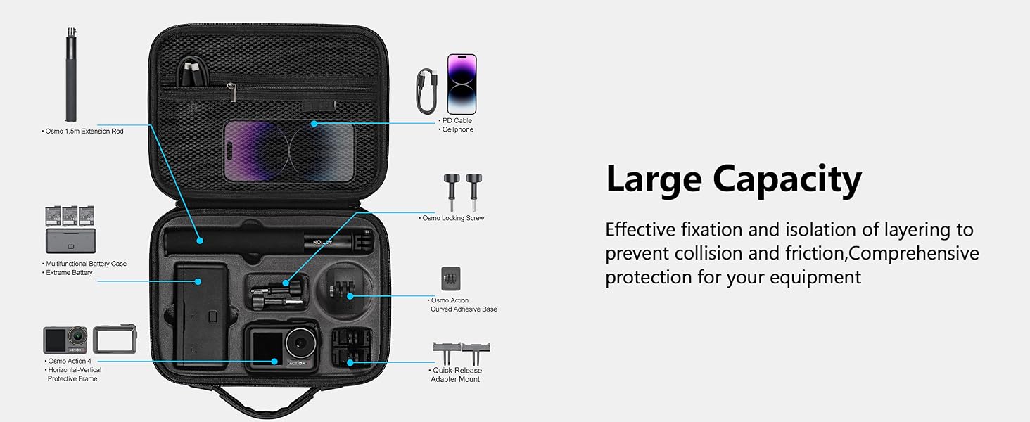 Protective Case for Action 4/3 This storage bag is specially designed for DJI Action 4/Action 3 camera accessories accessories, magnetic phone clamp, grip tripod, hand strap, extension bar, bicycle clamp, data cable and other action 4/action 3 accessories.