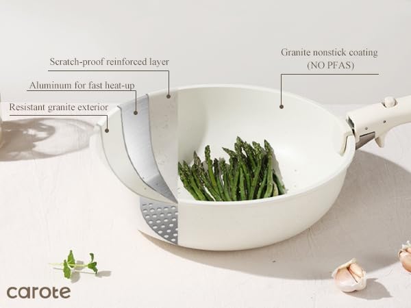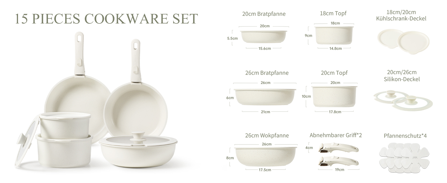 Съдържание на комплекта: комплектът тенджера и тиган включва 2 x тигана (20 см, 26 см), 2 x тенджери за готвене (18 см/1,8 л и 20 см/2,6 л), тиган 26 см (2,4 л), 2 x подвижни дръжки, 2 x стъклени капака със силиконов кръг (20 см и 26 см), 2 x херметически затворени капака (18 см и 20 см), 4 x протектора за тигани. Тези капаци и дръжки са подходящи за всяка тенджера и тиган.