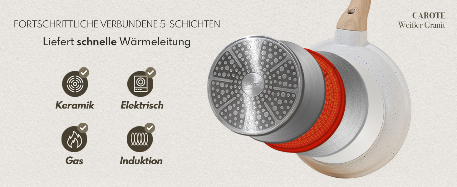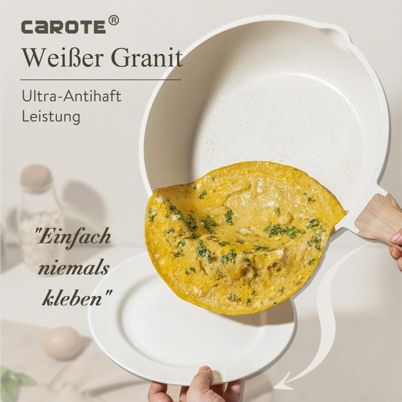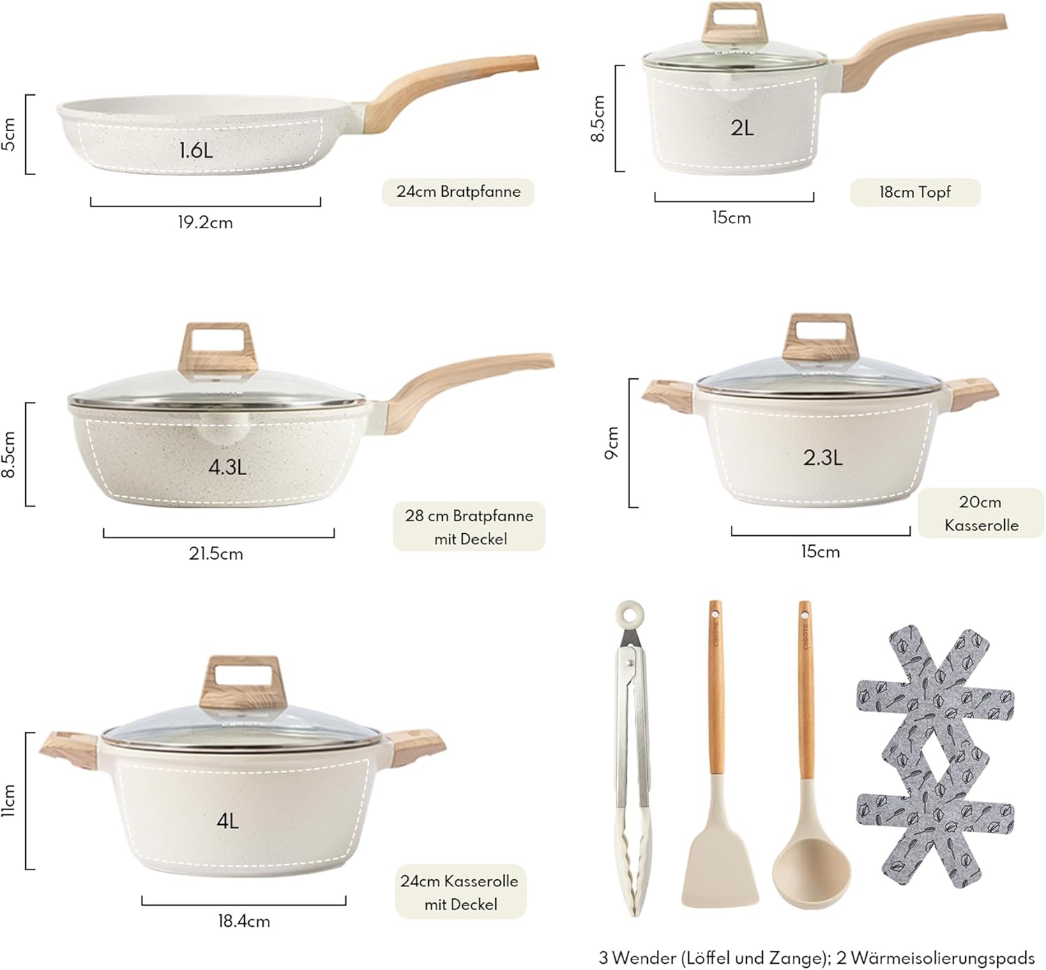 Съдържание на комплекта: 1 x тиган 24 см, 1 x тенджера с капак 18 см/1,7 л, 1 x тенджера с капак 20 см/2,3 л, 1 x тенджера с капак 24 см/4 л, 1 x дълбок тиган с капак 28 см, 1 x дървена шпатула, 1 x дървена лъжица за готвене, 1 x кухненски щипки от бяла неръждаема стомана, 2 x протектор за тиган