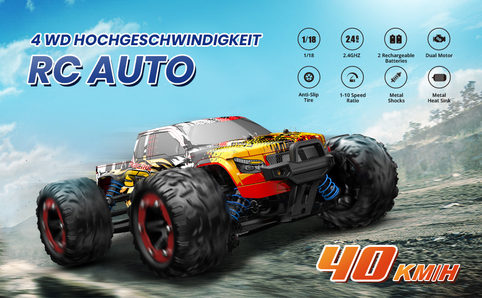 4 x 4 and 40 km/h super fast remote controlled car: Powered by a strong 380 DC brushed motor that can run 7.4 V 20000 rpm, which is a huge improvement for acceleration, this 4-wheel drive remote control truck can reach a maximum speed of up to 40+km/h 30 MPH. Delivers cross-country driving experience for high-speed thrills.
