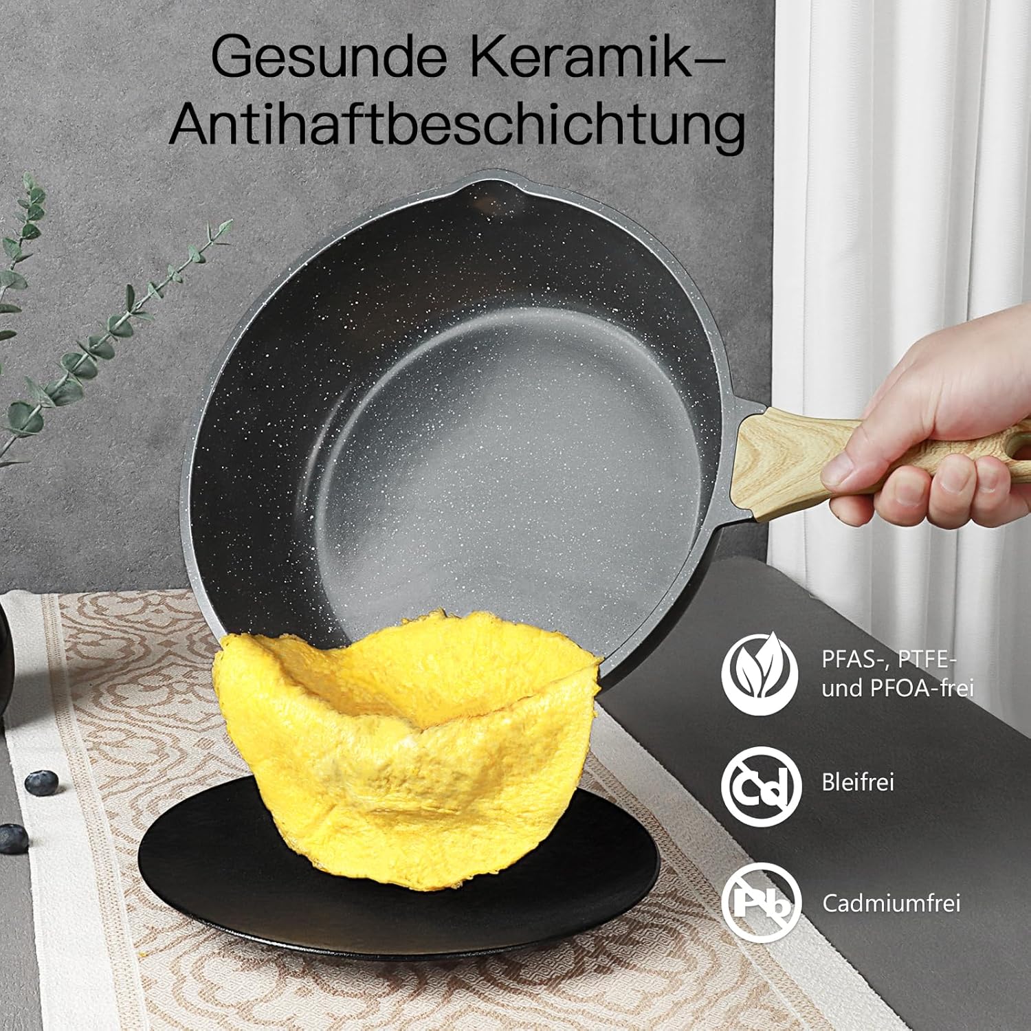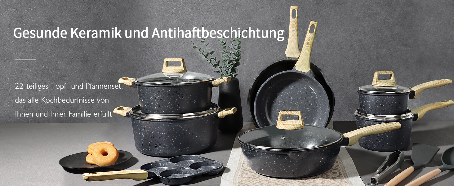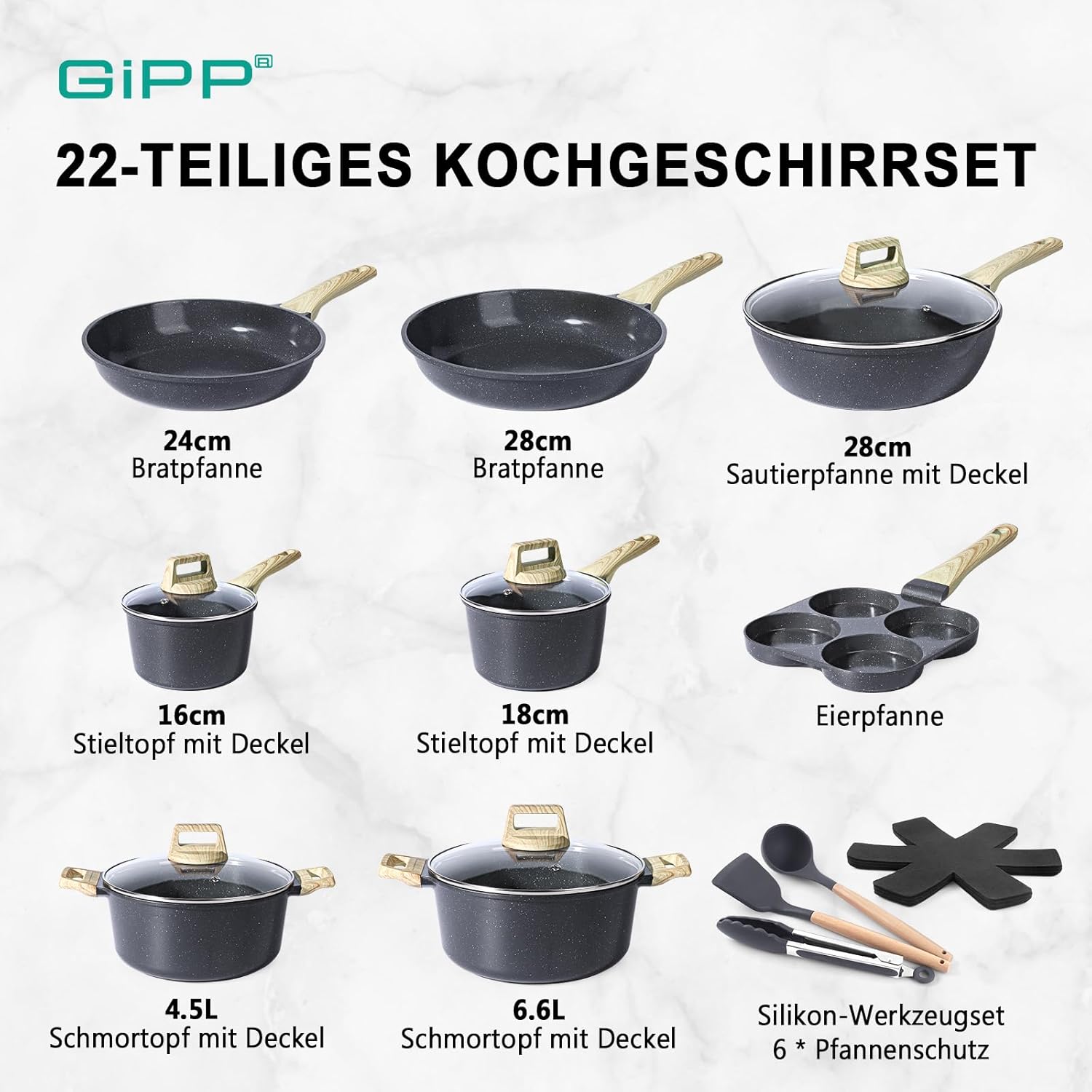 Съдържание на комплекта: тиган 24 см + тиган 28 см, тиган за сотиране 28 см с капак, тенджера с капак 1,5 л/2,5 литра, касерола с капак 4,5 л/7 литра, тава за 4 яйца, комплект силиконови инструменти, 6 x протектора за тигани