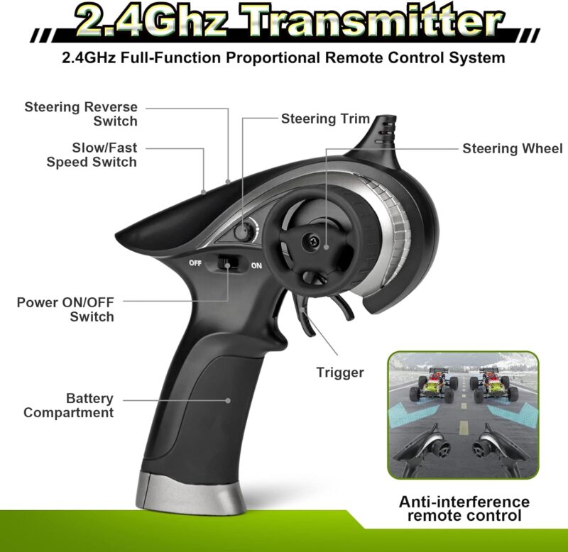 Two speed modes and fun: the 4WD remote control off-road vehicle has a 2.4 GHz radio system, no interference with other cars, splash-proof, anti-lock and shut-off at low battery voltage, allows a range of 280 feet. High/slow speed is optional for stagers, novices and kids.