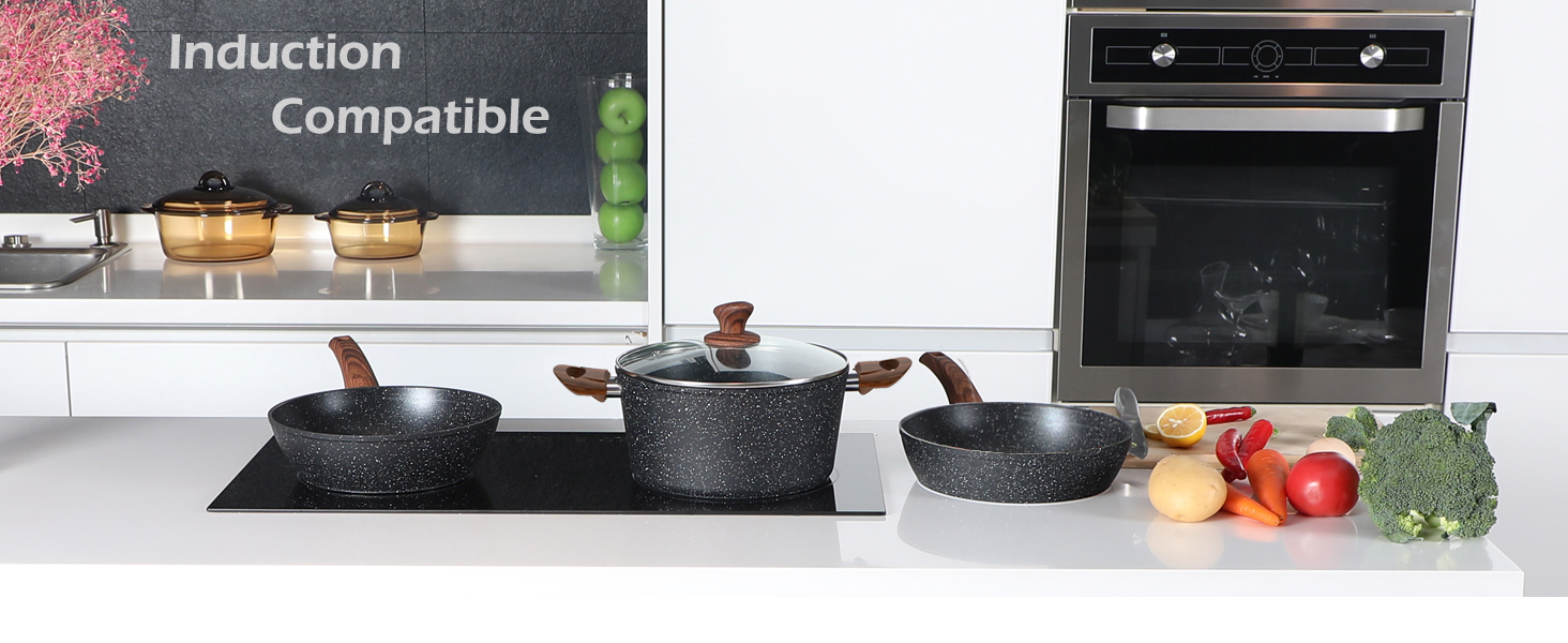 Съдържание на комплекта: Включва тиган 20 см, тиган 28 см, дълбок тиган 24,6 см с капак, тенджера 1,5 см с капак, гювеч 3 см с капак, гювеч 5 см с капак, 1 x силиконова шпатула, 1 x силиконова лъжица за готвене.